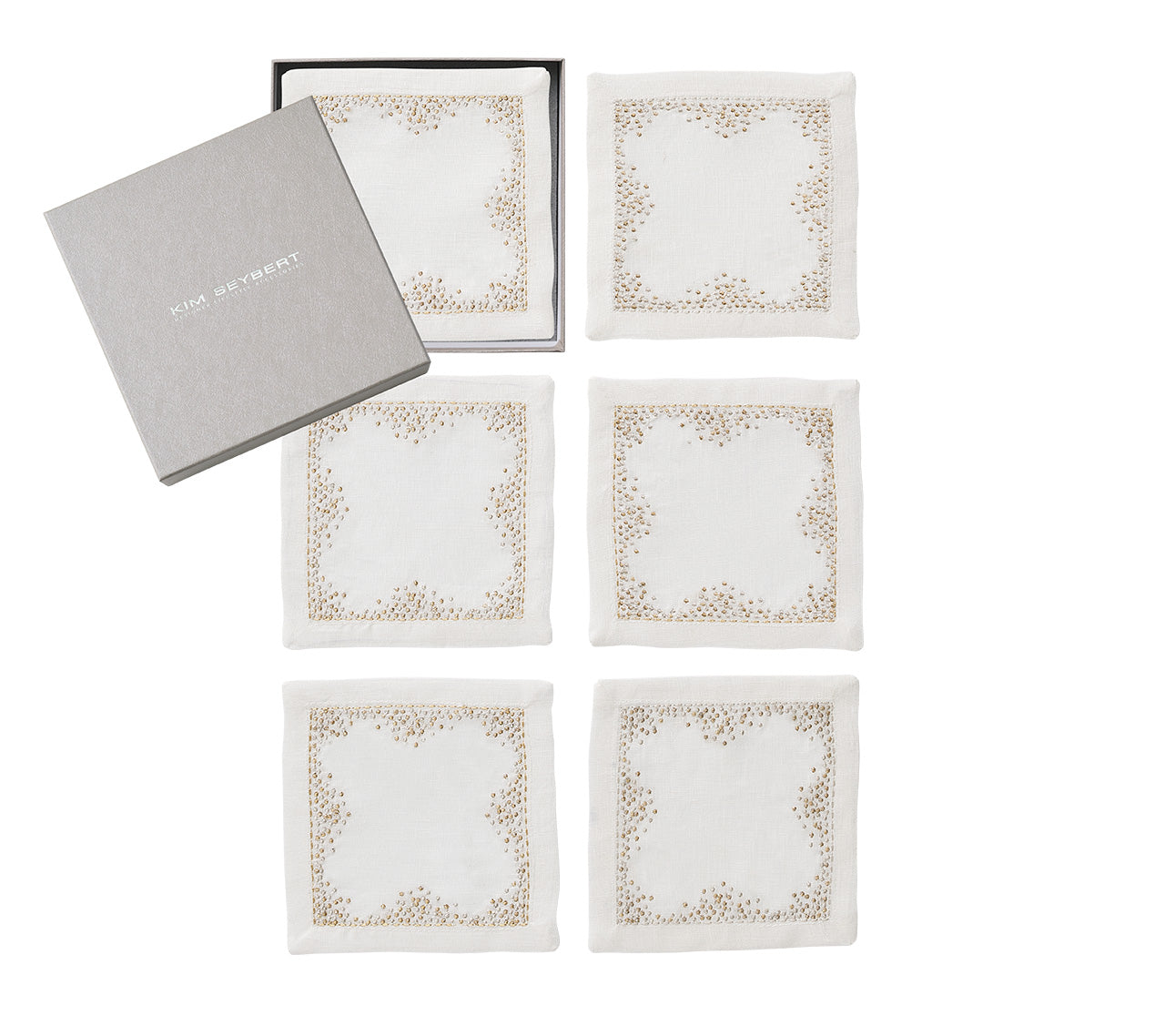 The spray of festive silver and gold dots on the Pin Dot Cocktail Napkin creates an elegant border on the crisp white linen background. A sophisticated approach to a classic cocktail napkin, the Pin Dot Cocktail Napkin adds a touch of elegance to any celebration.