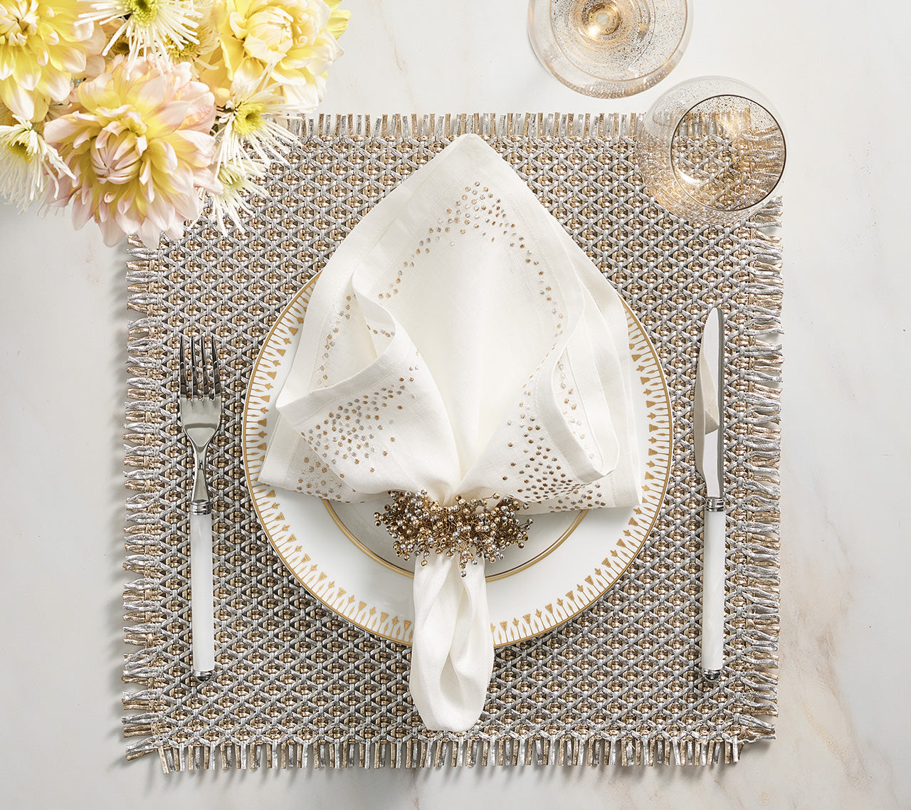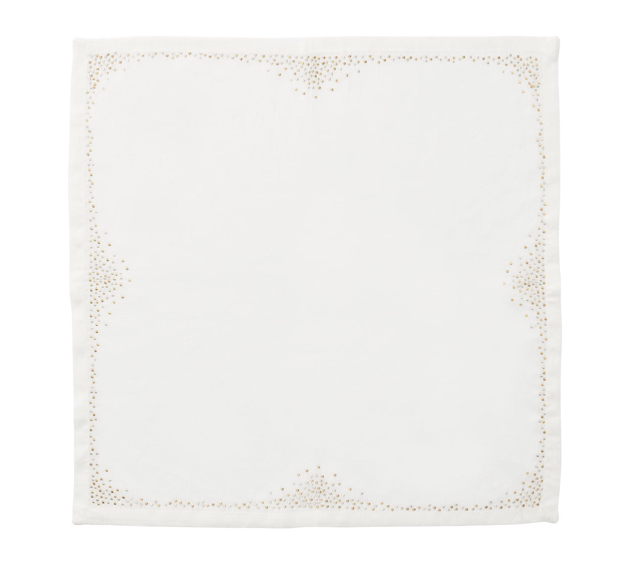 This white linen Pin Dot Napkin is characterized by a classic design that features a subtle touch of elegance in the form of pin dots carefully applied around the border. The gold and silver dots gracefully complement any metallic cutlery you choose for your dining table.