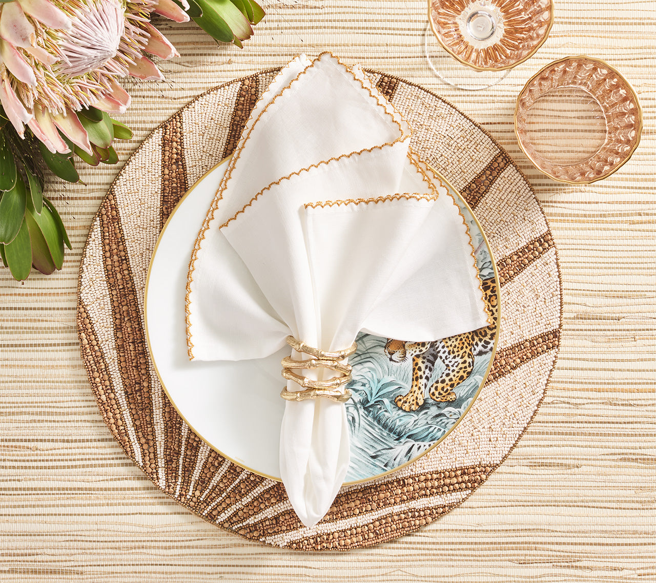 Bring the spirit of the tropics to your table with the Royal Palm Placemat. Rich in texture and warmth, this round placemat is adorned with hand-applied wooden beads, sparkling glass gems, and shimmering sequins—each element carefully arranged to evoke the lush elegance of a palm-fringed retreat. Its natural aesthetic effortlessly blends laid-back charm with refined detail, making it perfect for both relaxed alfresco dinners and polished indoor gatherings. Pair with coordinating linen napkins or gilded napkin rings to elevate your tablescape.