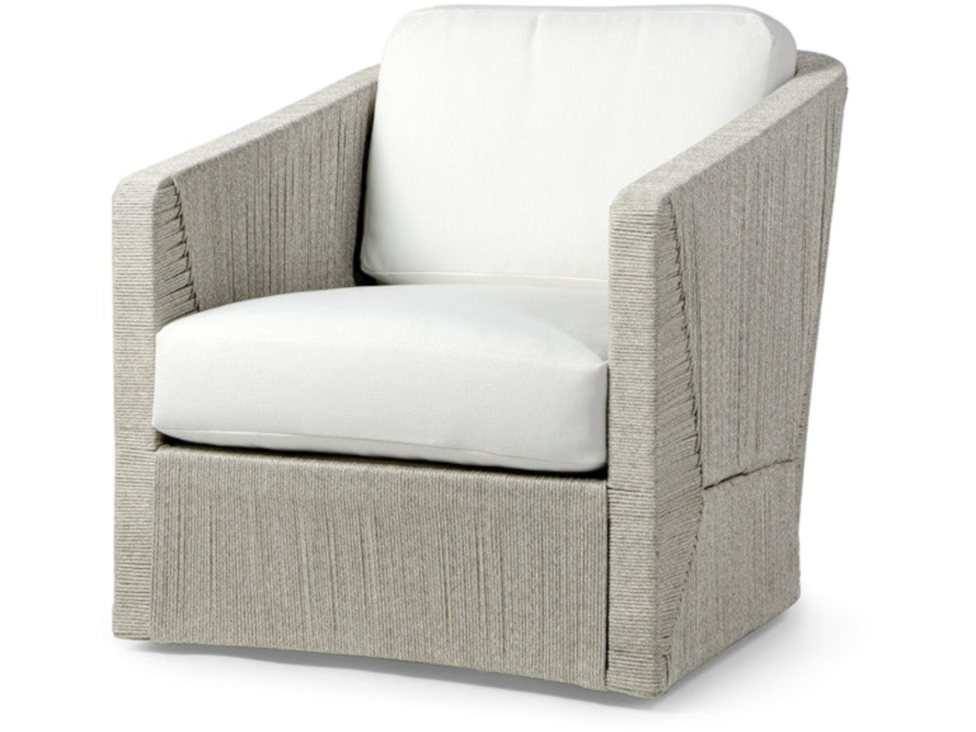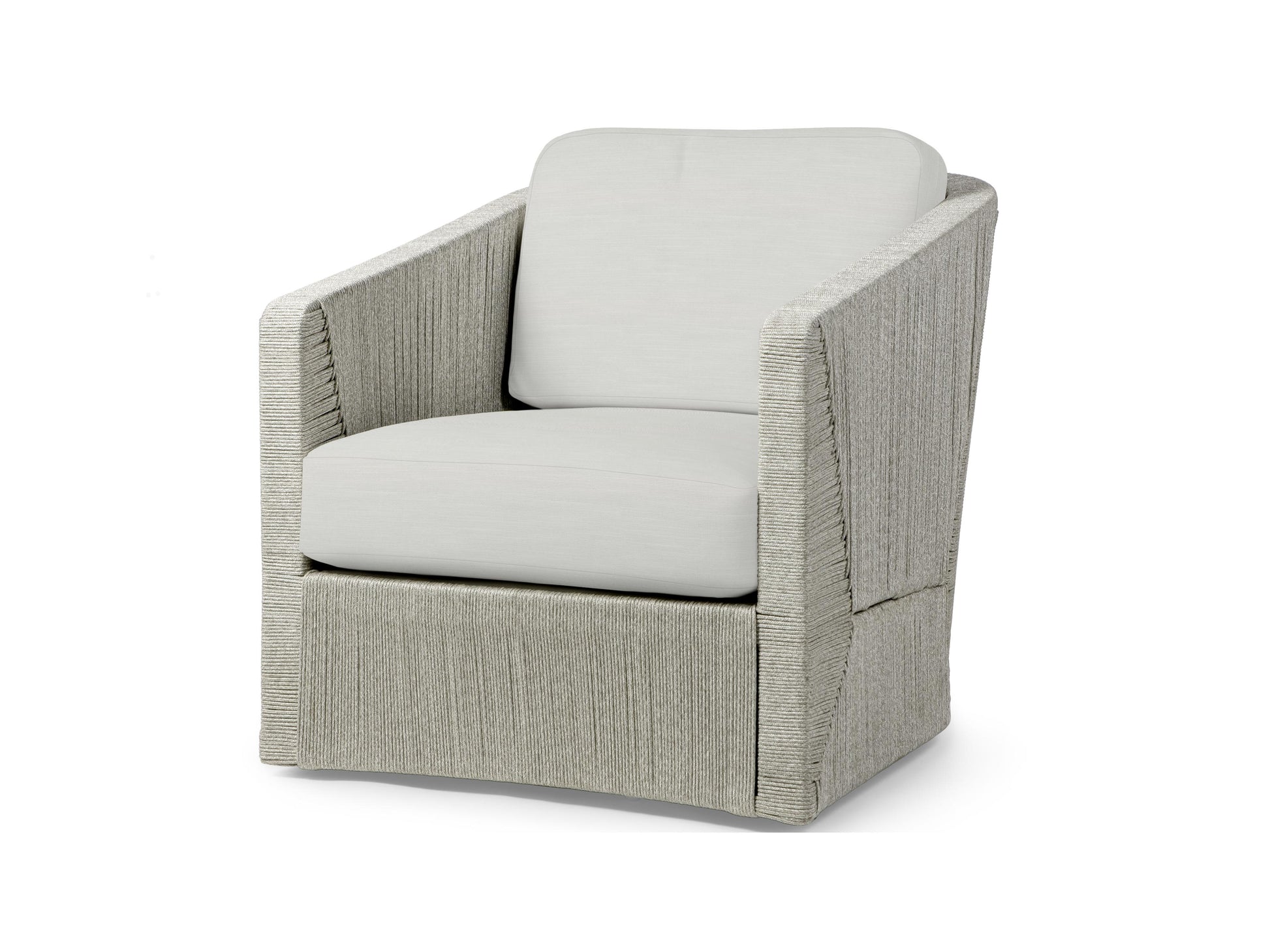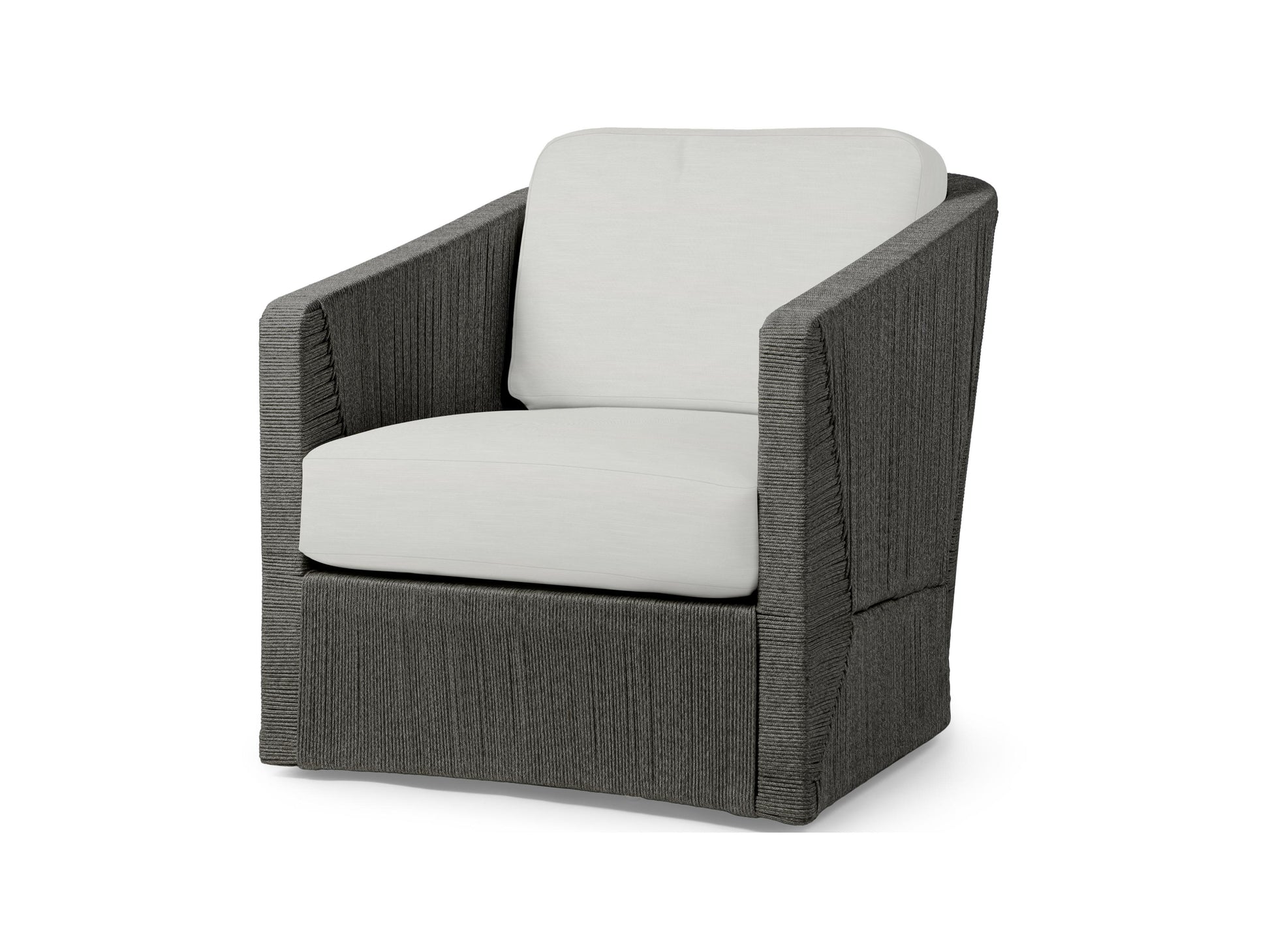 The Point Dume Outdoor Swivel Chair combines elevated design with outdoor functionality. Featuring a 360-degree swivel mechanism, this chair is crafted with a powder-coated aluminum frame and wrapped in hand-woven synthetic rope. The UV-protected, all-weather weave offers exceptional durability, resisting cracking, peeling, fading, and breaking. Includes loose seat and back cushions for ultimate comfort.