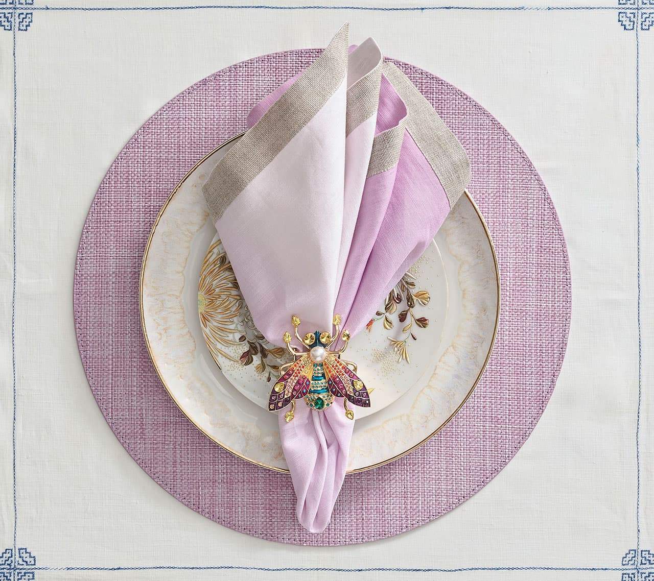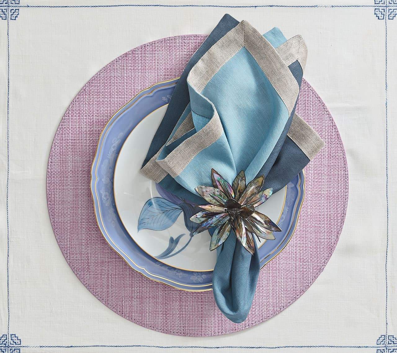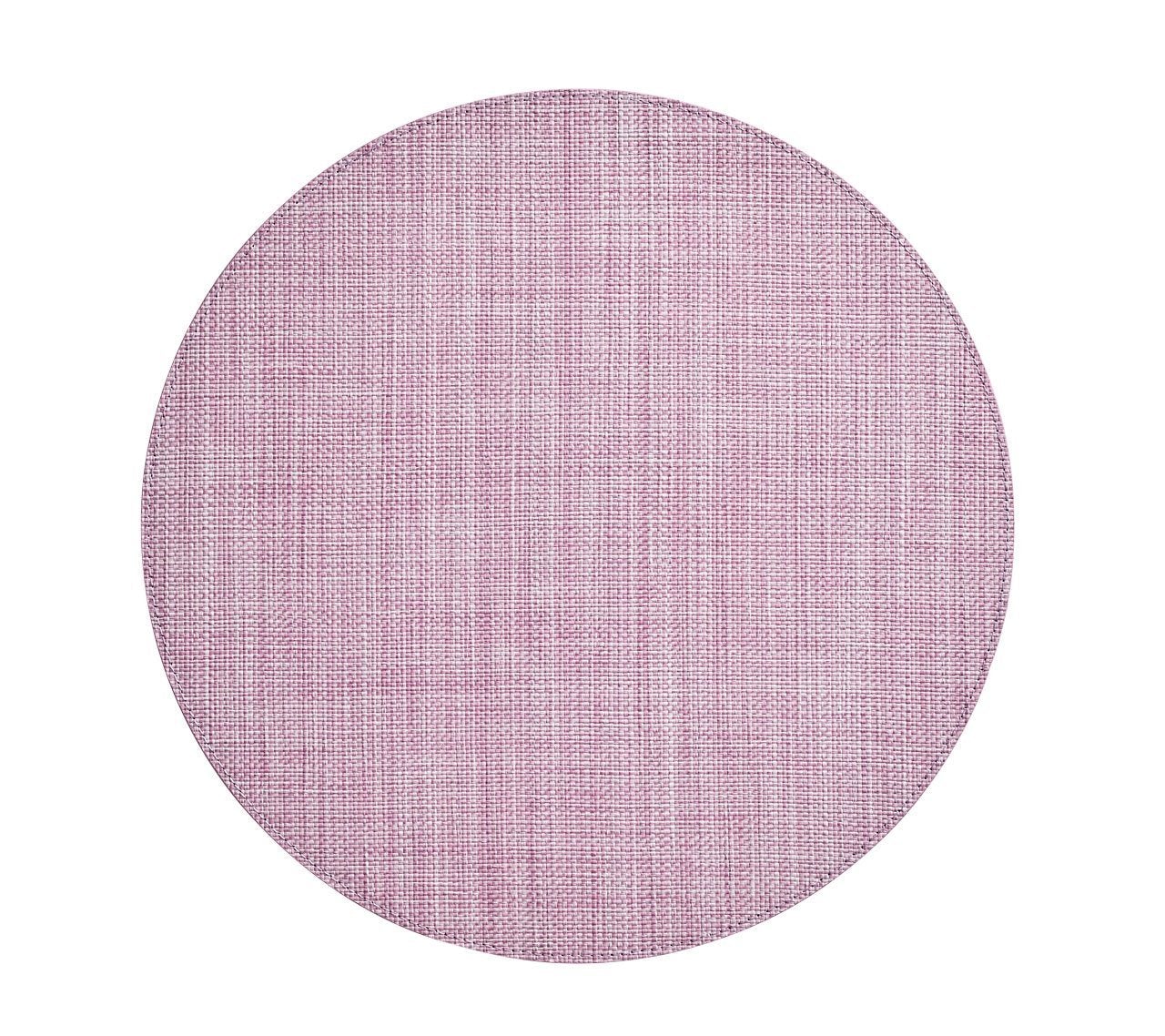 The round Portofino Placemat in lilac allows for easy outdoor entertaining while capturing the heathered texture of the traditional cross-dye cloth application. This woven placemat has the look and feel of raffia yet is easily cleaned. Offered in two pastel colors (natural and lilac), this round placemat is a summertime entertaining staple.