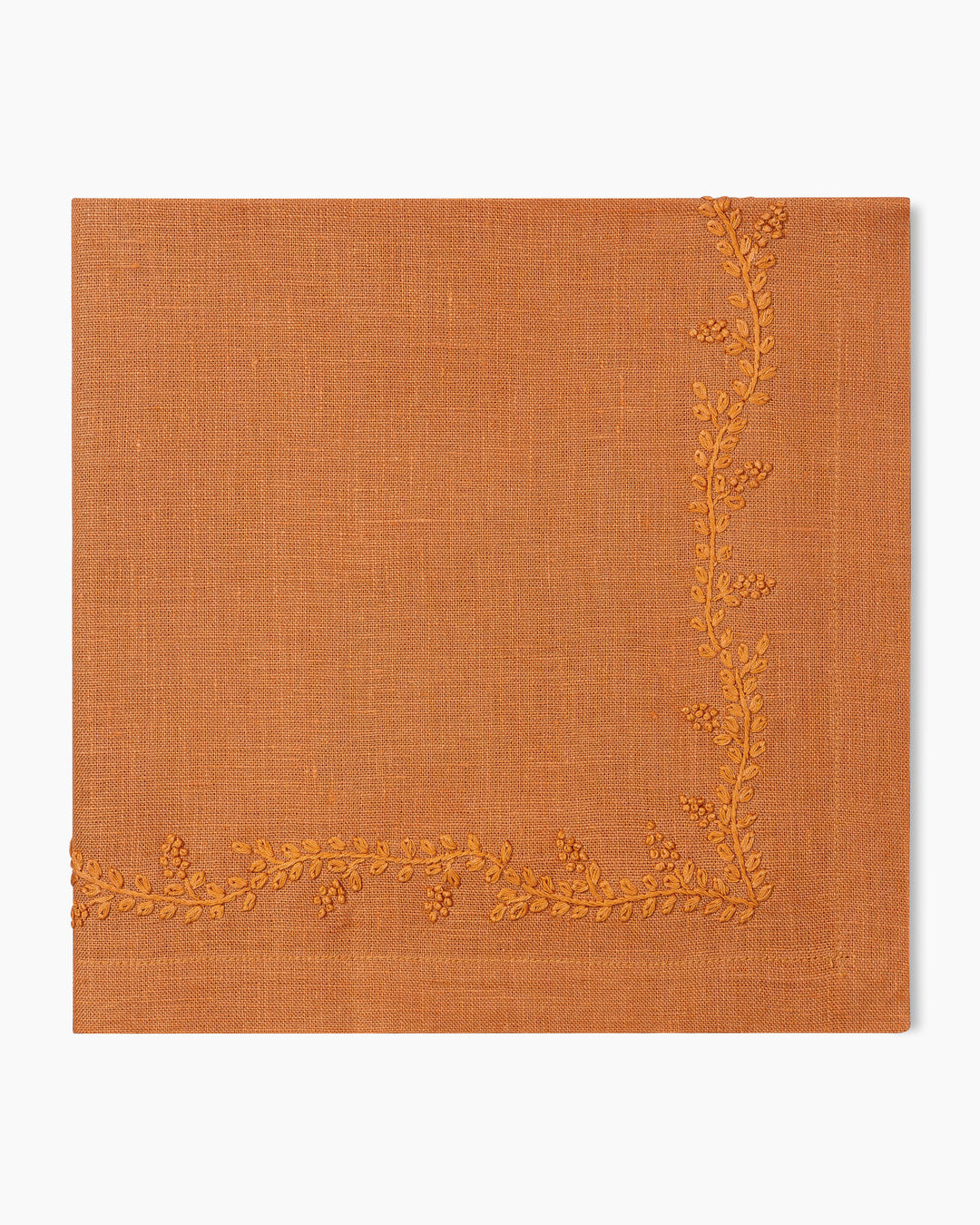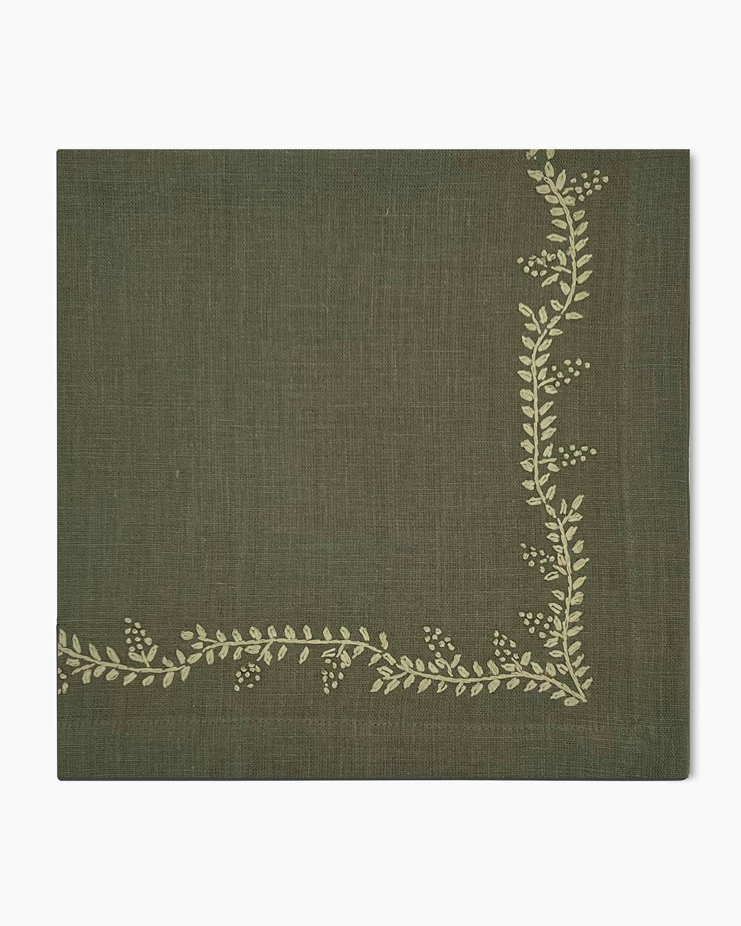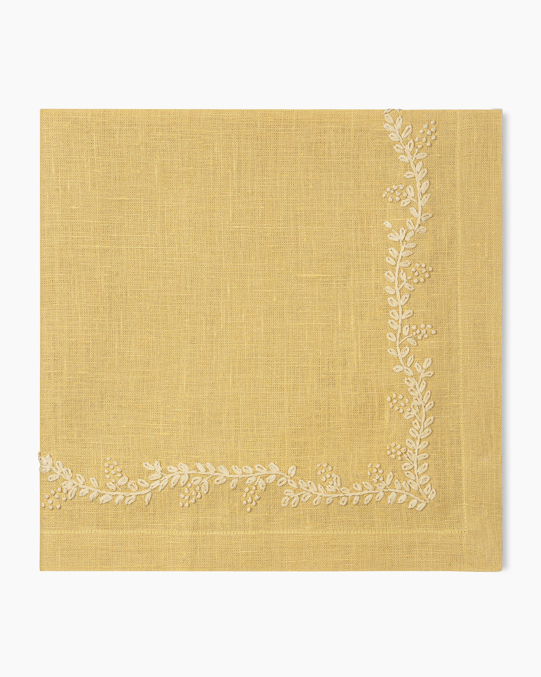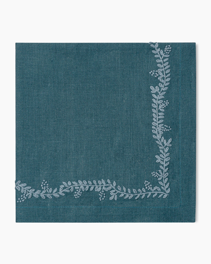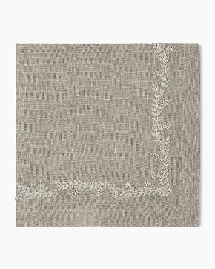 Crafted from pure linen, the Prism Vine Linen Dinner Napkin is finished with a clean mitered hem and delicately hand-embroidered on all four sides. A timeless essential, it pairs elegance with everyday usability.