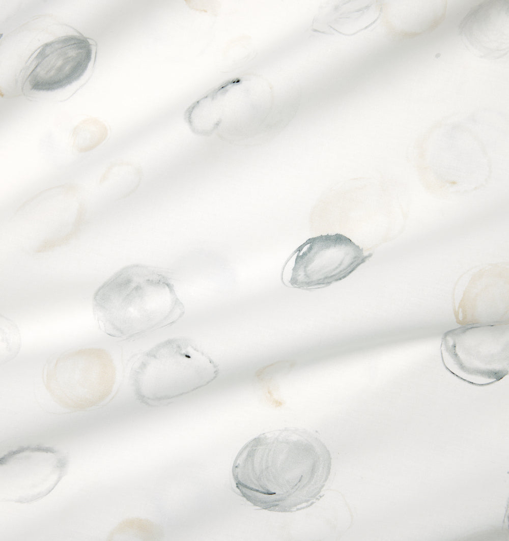 Brushed-on shades of grey and taupe create an all-over pattern on a Punti's indulgently soft and breathable percale base. The coordinating Squillo embroidered collection is tied together with two lines of grey and taupe, which form whimsical loops as they dance around the four sides. Together, the collections add a playful modernity to the classic polkadot, elevating the bedroom while infusing it with a subdued sprightliness.