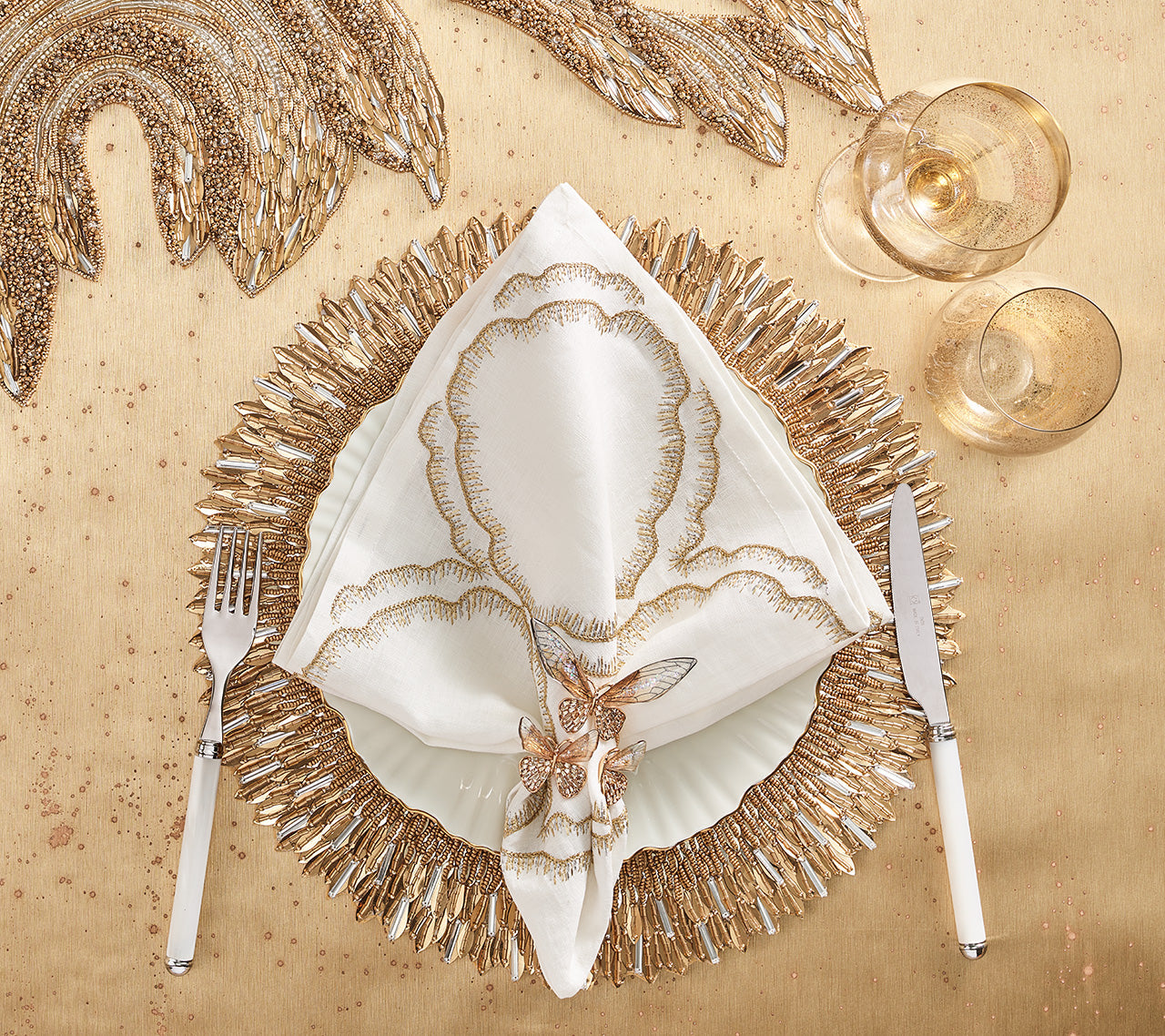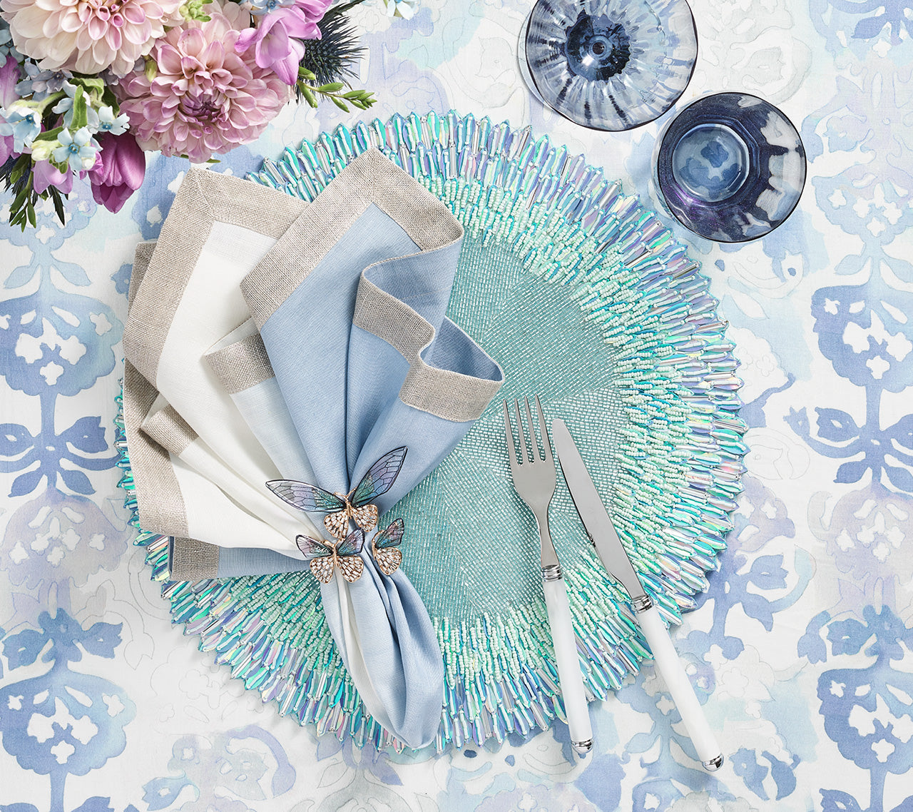 Capture the brilliance of sunlight at your table with the Ray Placemat. Layered, hand-applied feather-like sequins radiate outward from a beautifully beaded center, mimicking the soft beams of golden light. Intricately composed of seven bead variations, each placemat dazzles with depth, movement, and shimmer. Whether in radiant Gold/Crystal or ethereal Periwinkle & Seafoam, the Ray Placemat brings elevated artistry to both everyday meals and formal affairs. For a truly luminous tablescape, pair it with the coordinating Ray Table Runner.