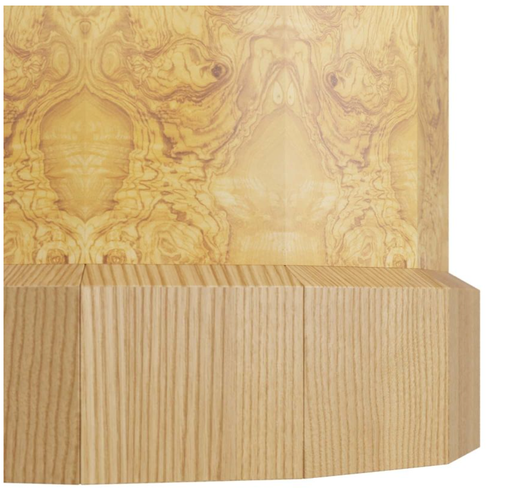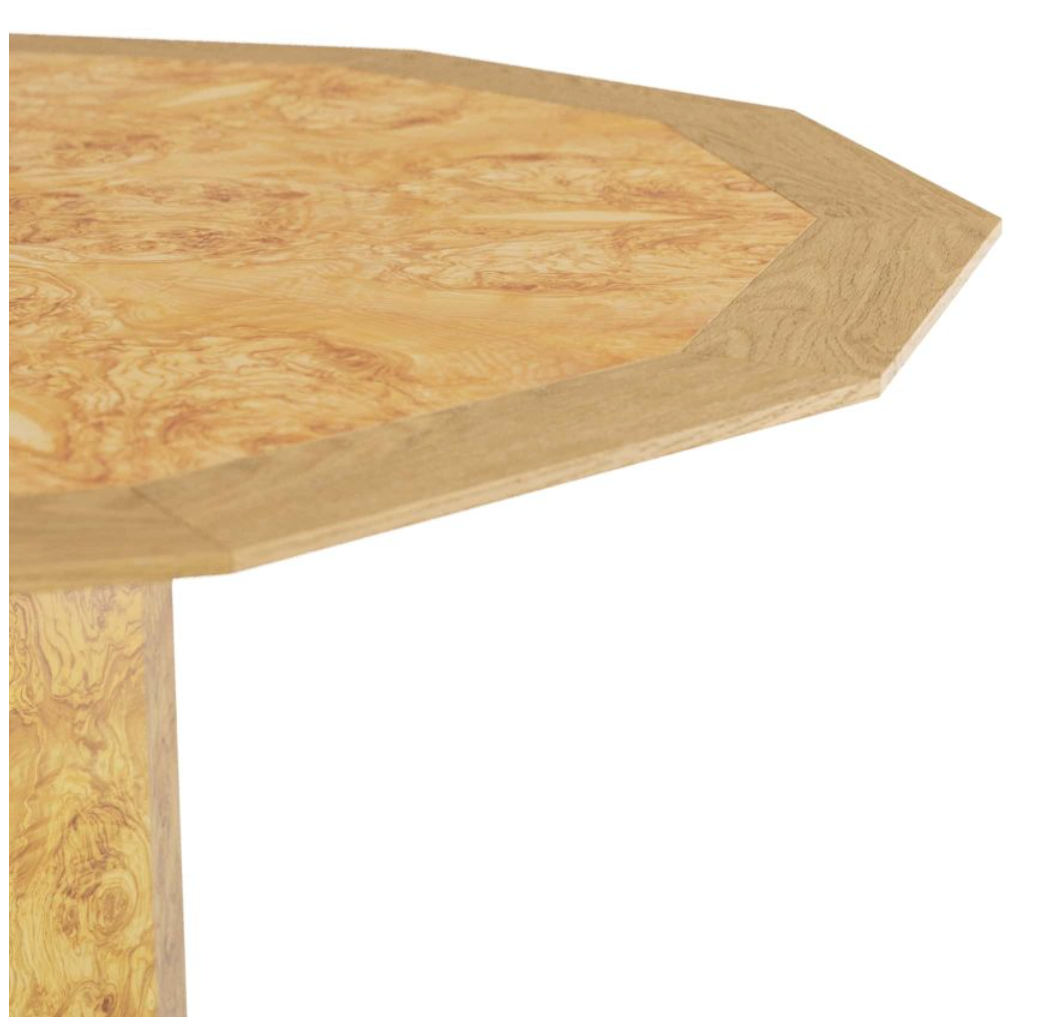 IN A DYNAMIC MIX OF BLONDE BURL OAK AND CHESTNUT OAK VENEERS, THE REUBEN STUNS WITH ITS MAXIMALIST DESIGN SENSIBILITY AND OCTAGONAL SHAPE. THE PEDESTAL-BASE TABLE IS SCALED FOR USE AS AN ENTRY OR DINING ROOM TABLE. FINISHES WILL VARY.