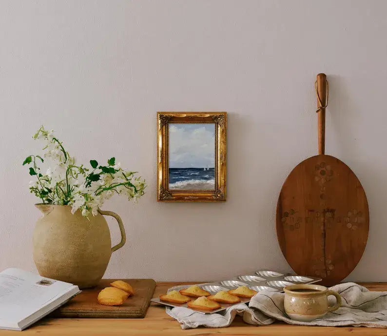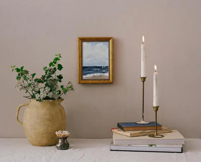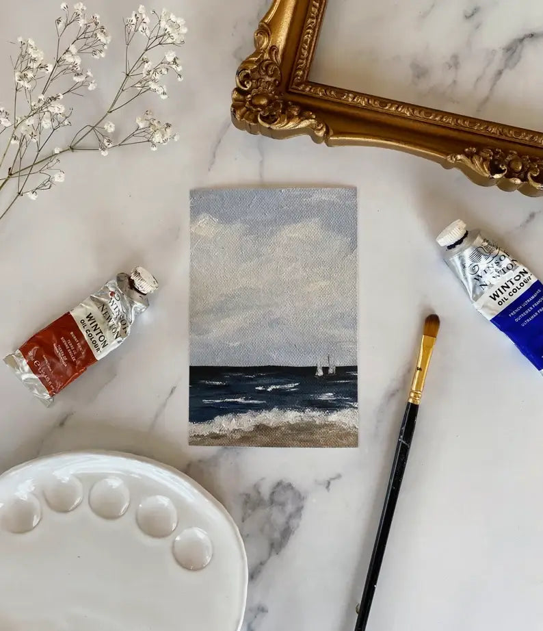 A quiet coastal scene with open sky and distant sails. This piece captures the hush of waves meeting the shore and the ease of slow mornings by the sea. Beautiful paired with other coastal works for a serene gallery wall.