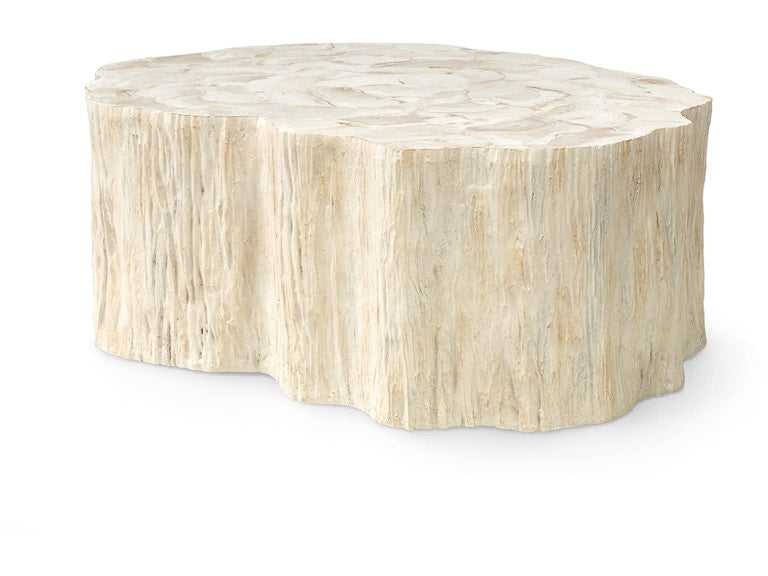 The Sandstone Coffee Table features an inlaid fossilized clam shell top set on a sculptural stonecast base molded from a natural tree trunk. Finished in soft, warm cream tones, this organically inspired piece highlights the natural beauty of its materials—each table offering subtle variations in shell color and grain for a one-of-a-kind look.