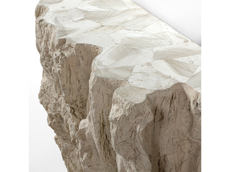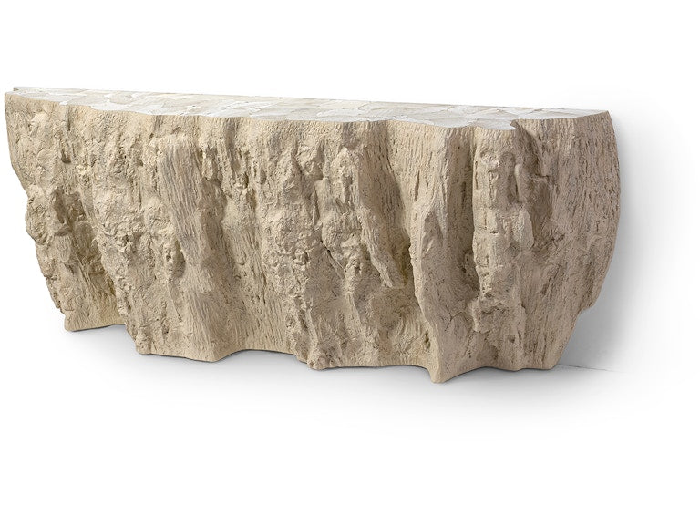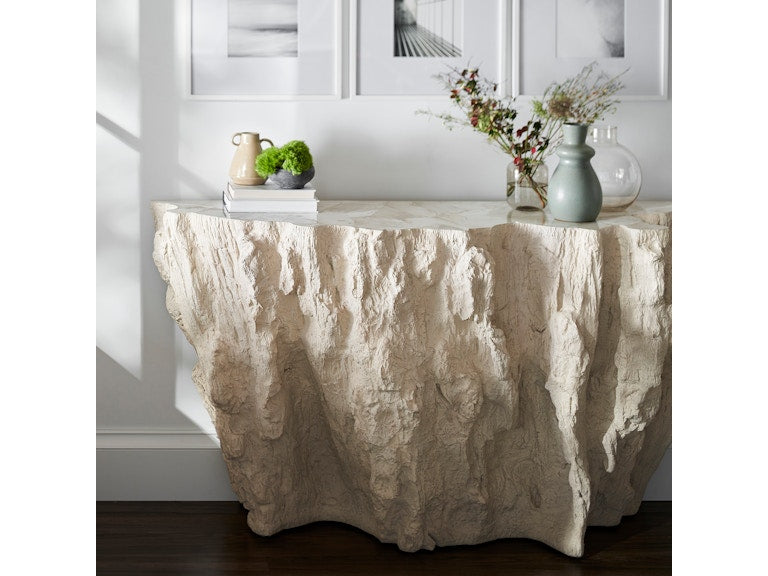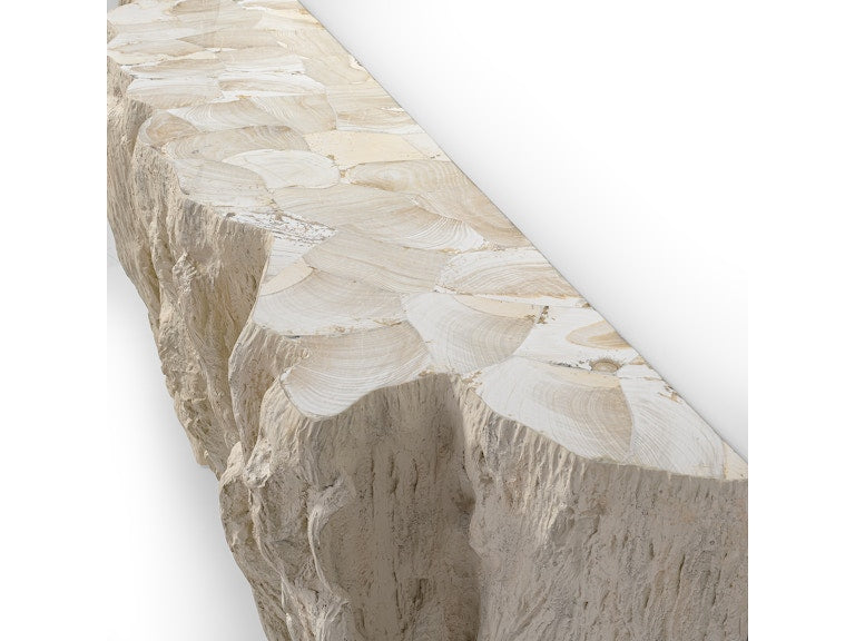 The Sandstone Console features an inlaid fossilized clam shell top paired with a stonecast base molded from a natural tree trunk and finished in warm cream tones. Each piece celebrates the inherent beauty of its materials—offering natural variation in the color and grain of the clam shell for a truly one-of-a-kind look.