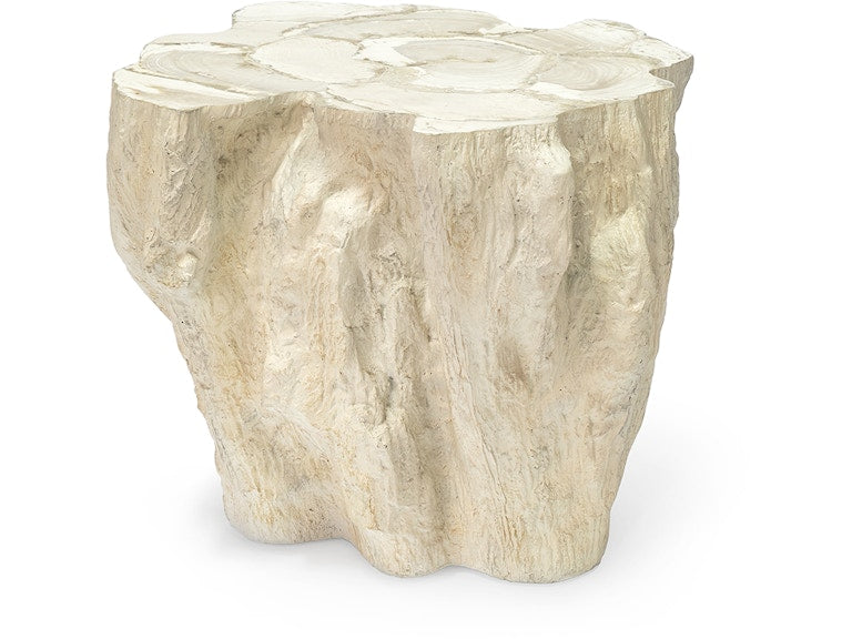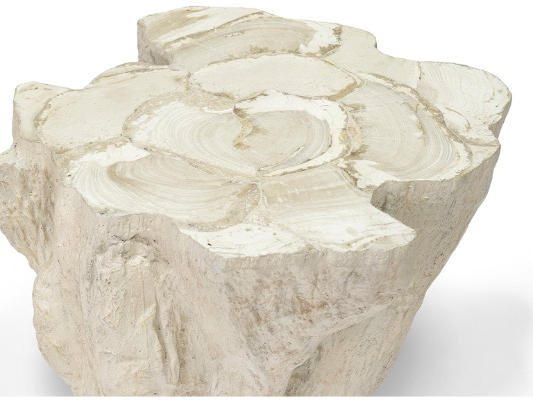 The Sandstone Side Table features an inlaid fossilized clam shell top set on a sculptural stonecast base, molded from a natural tree trunk and finished in soft, warm cream tones. Each piece highlights the unique texture and grain of the clam shell, creating a one-of-a-kind surface that adds depth and natural beauty to any room.