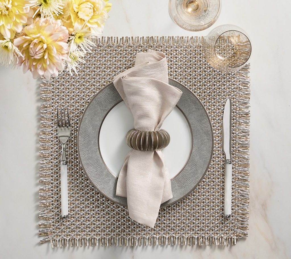 A refined interpretation of the waxing and waning moon, the crescent-shaped Demilune Napkin Ring is formed by hand-folding metal discs. Each folded disc is hand-arranged on the metal base. This striking napkin ring adds a sculptural quality and luster to any table setting.
