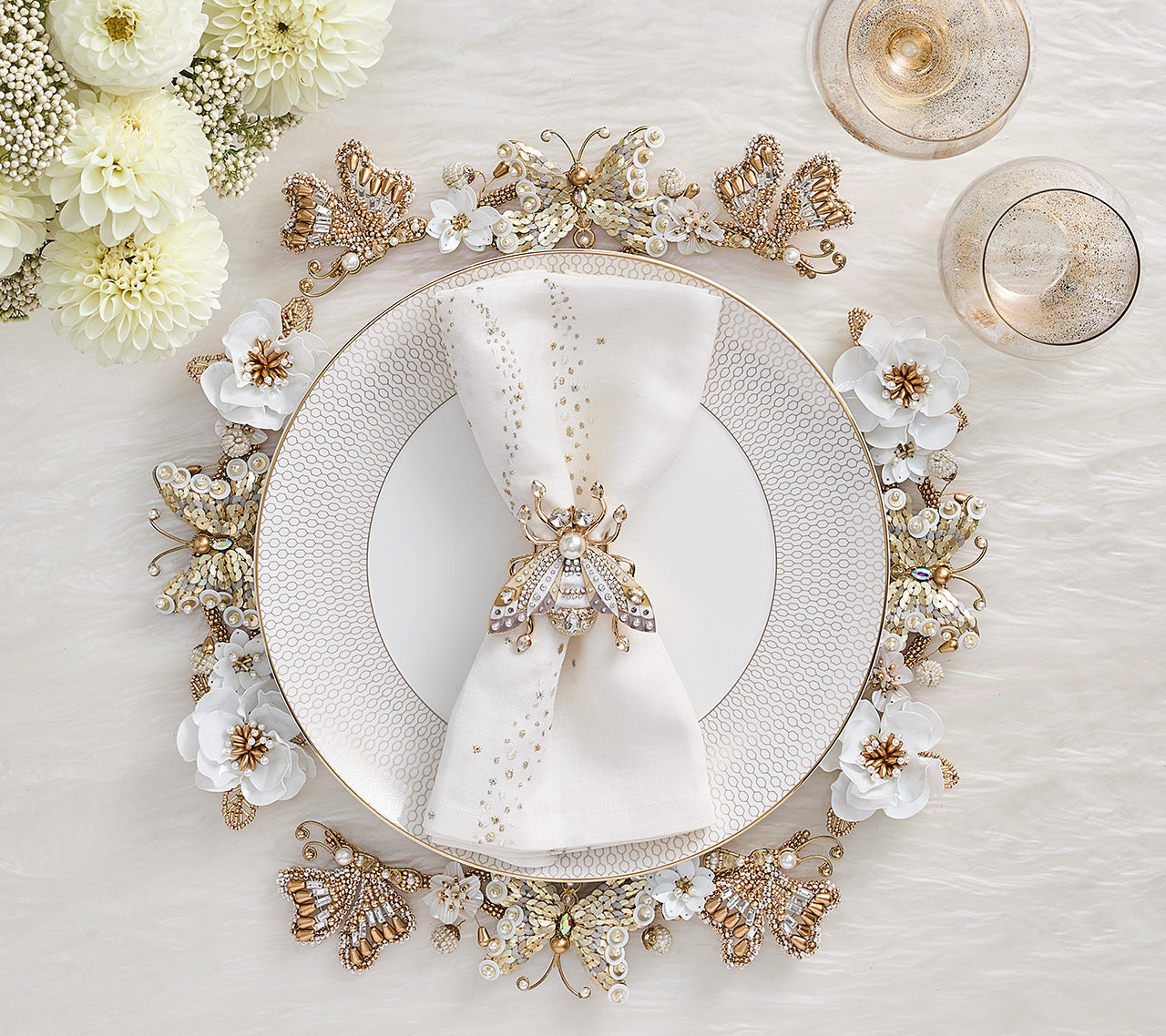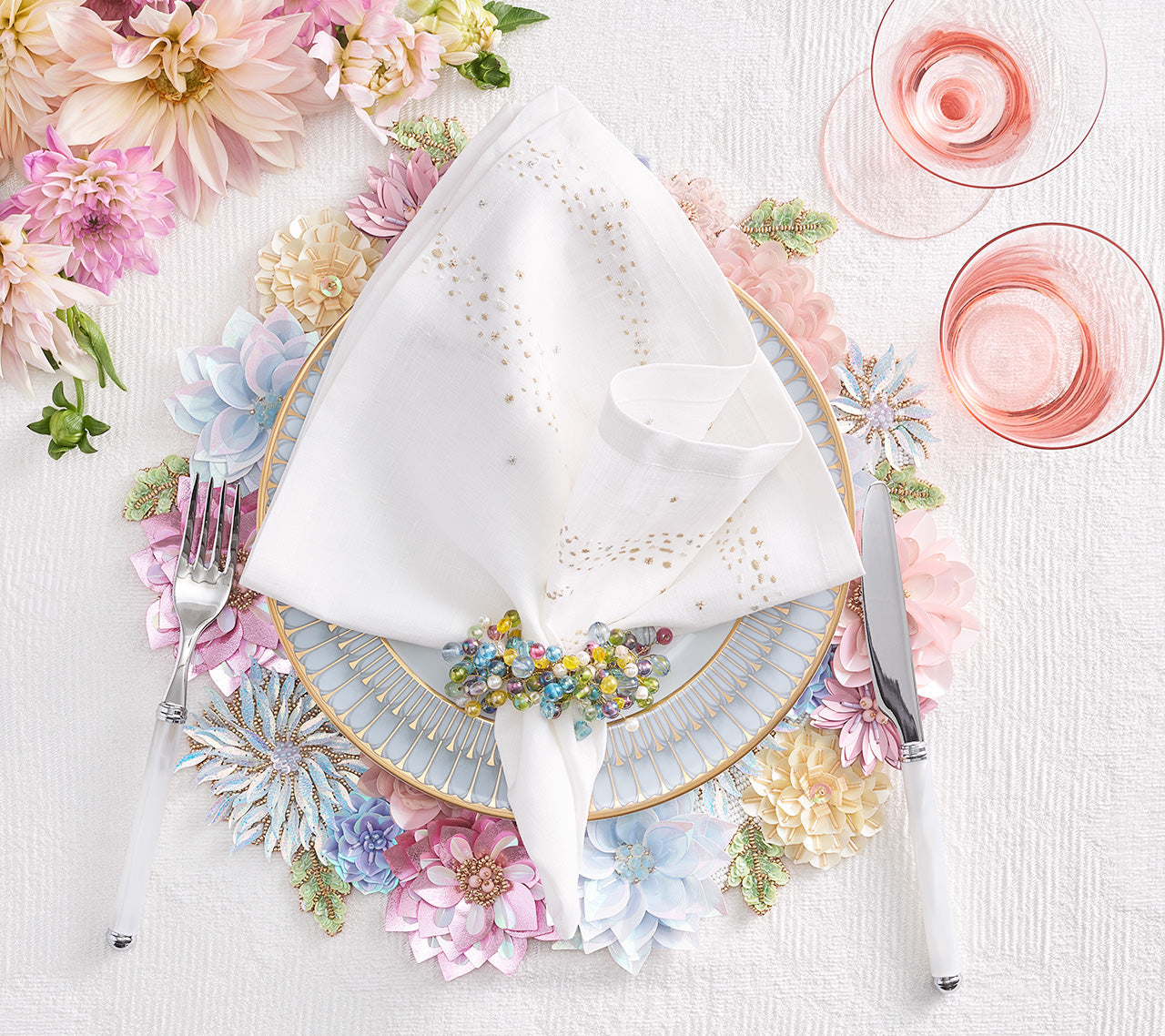 Specks of gold, beige, gray, and silver dot the crisp, white Star Spray Napkin like an enchanted wintery scene. The delicately embroidered dots mimic a spray of glitter on the white linen backdrop. Perfect for a casual dinner or lively celebration, the subtle elegance of this embroidered napkin will elevate any table.