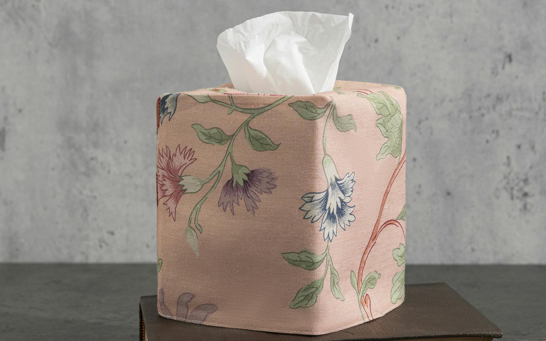 The Simone Tissue Box Cover by Matouk features a breathtaking floral design inspired by a 19th-century English fabric remnant, hand-selected from Schumacher’s renowned archive. Printed on our ultra-soft Roman linen, this piece transforms a functional item into a work of art—adding elegance and charm to any space. Each cover is cut from a larger repeat, making every piece beautifully unique.