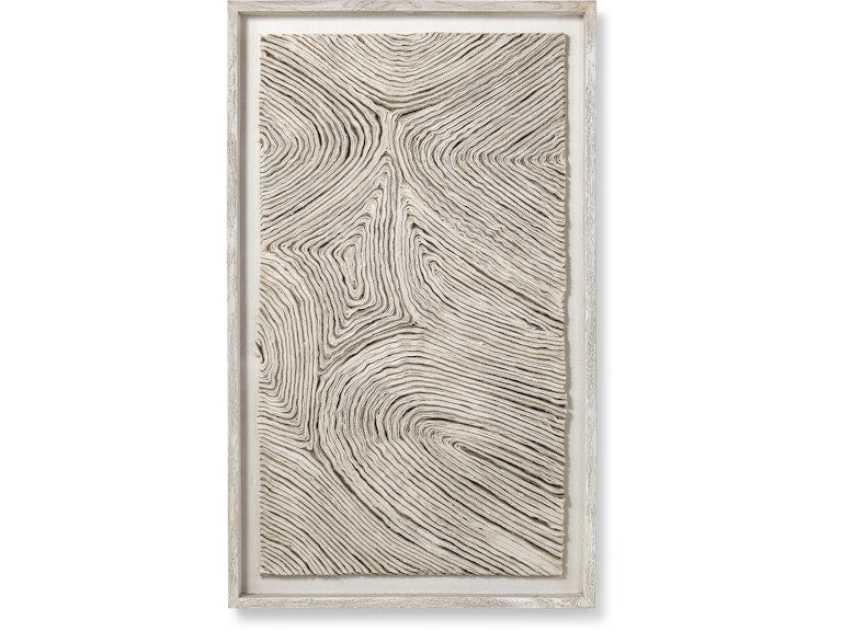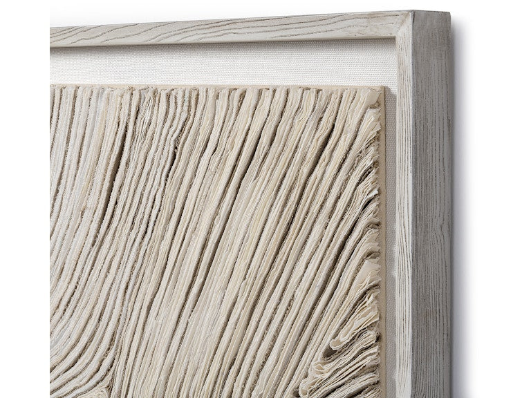 The Song Rectangular Wall Décor features hand-folded layers of fabric in soft natural and white tones, sewn to create a richly textural, tonal composition. Set against a linen background and framed in an oak wood frame with a white cerused finish, this piece brings quiet dimension and refined craftsmanship to any space.
