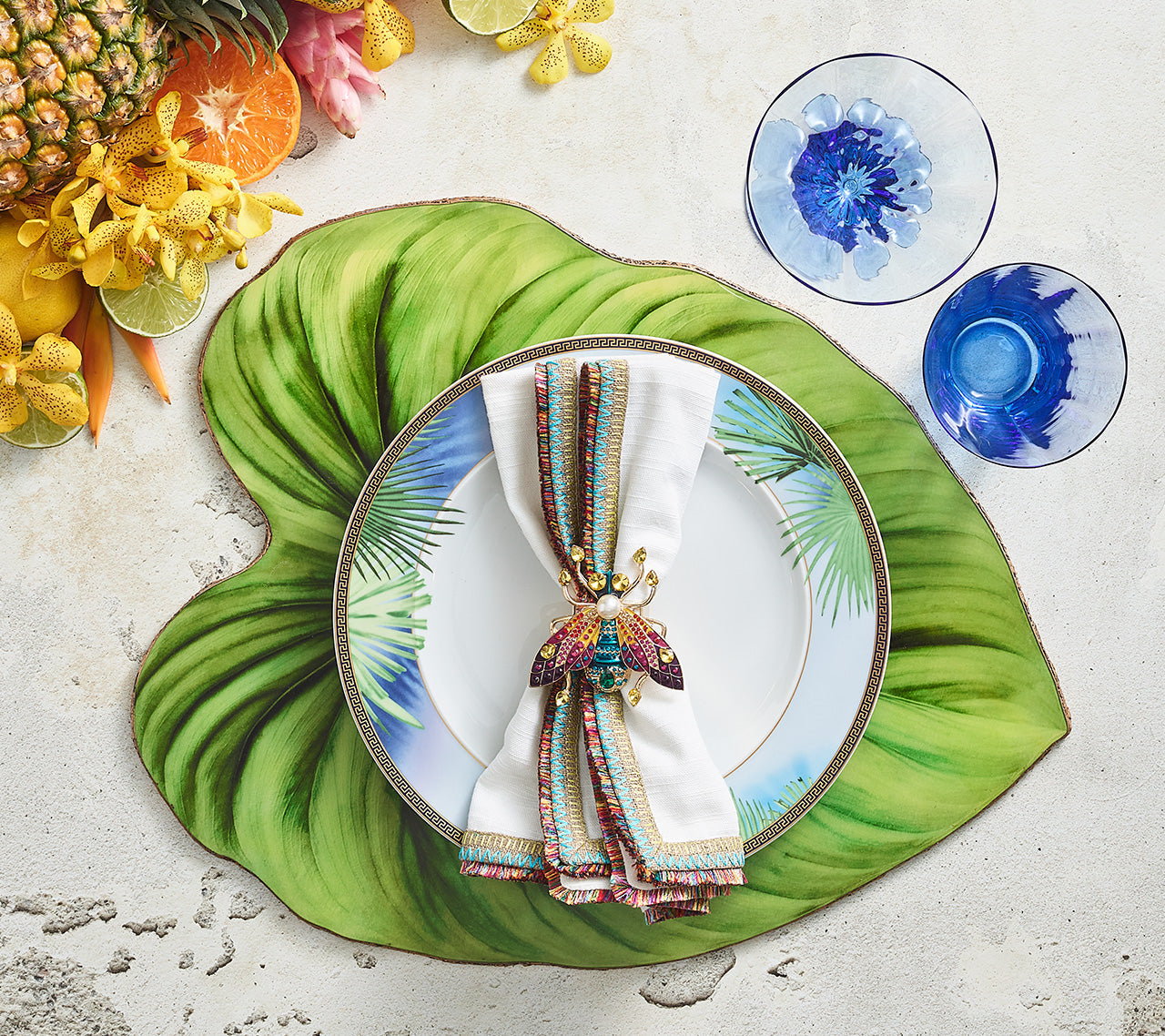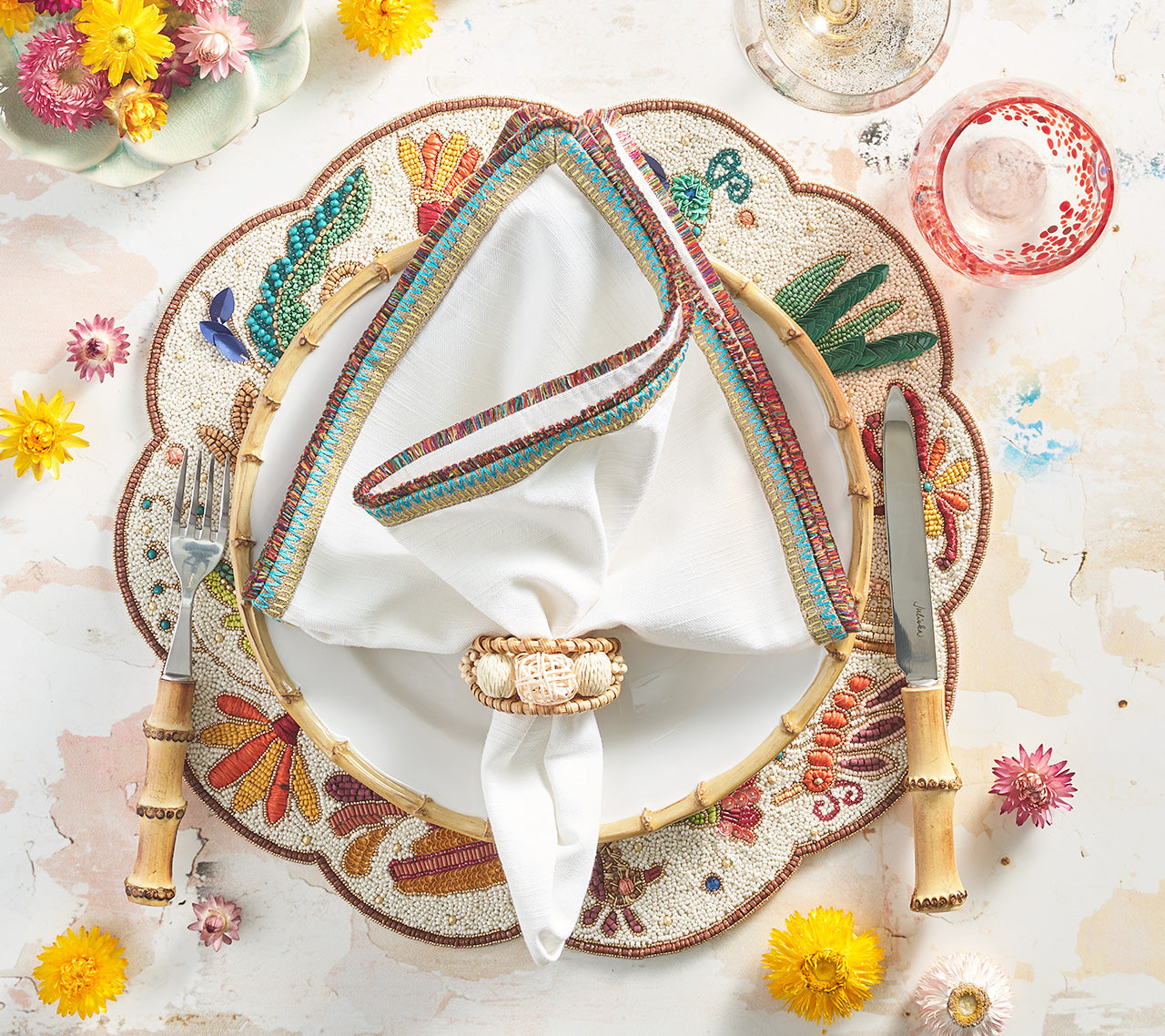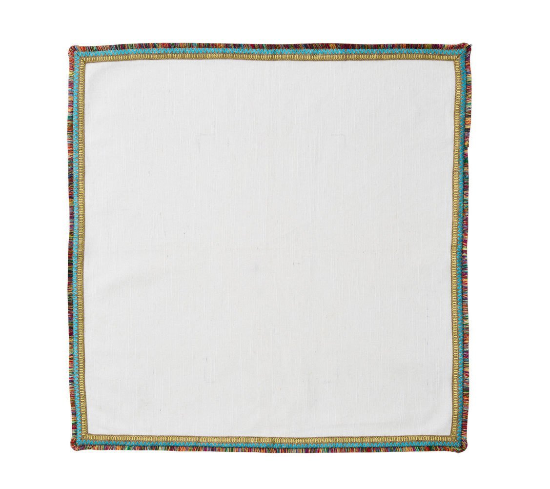 Much like their name, these napkins offer every color imaginable. Their borders are embroidered with multi-colored threads that call to mind everything from African themes to Peruvian motifs. Perfect for wanderlust-themed parties.