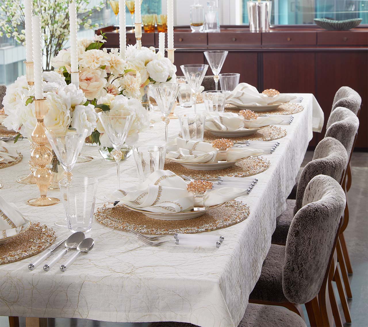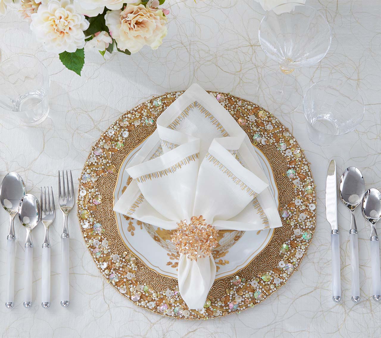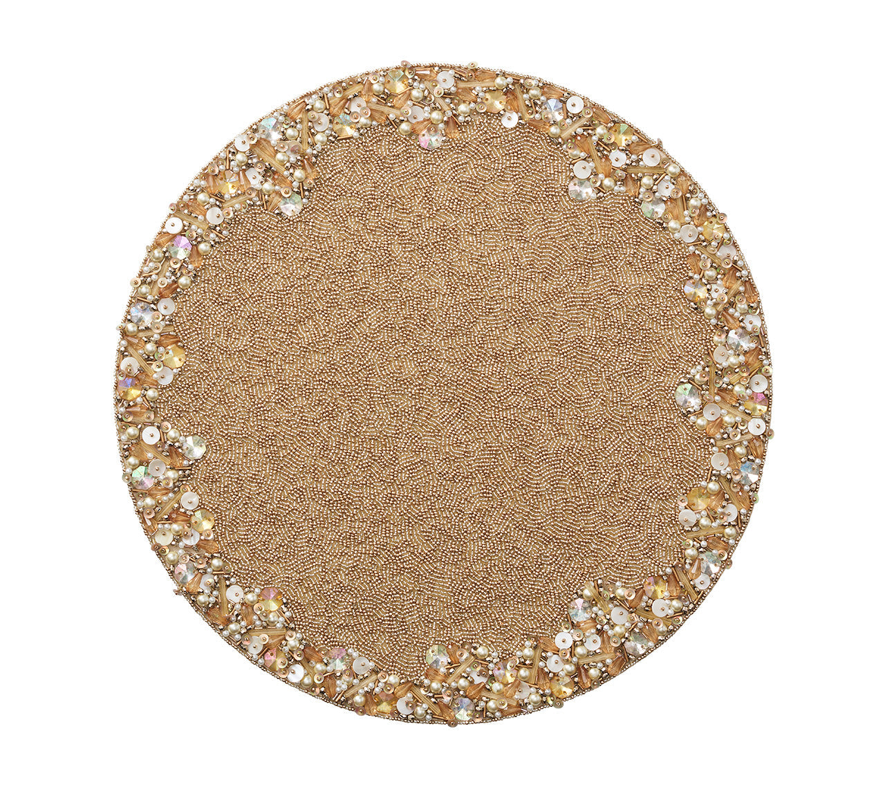 Immerse yourself in celestial elegance with the Supernova Placemat—an opulent masterpiece that radiates light and luxury. Featuring over 15 unique bead variations, including shimmering mother-of-pearl accents and iridescent gemstones, this galactic-inspired design dazzles with every detail. A luminous frame of champagne and crystal beads bursts into brilliance against a gold-textured backdrop, offering a captivating contrast that transforms any meal into a grand occasion.