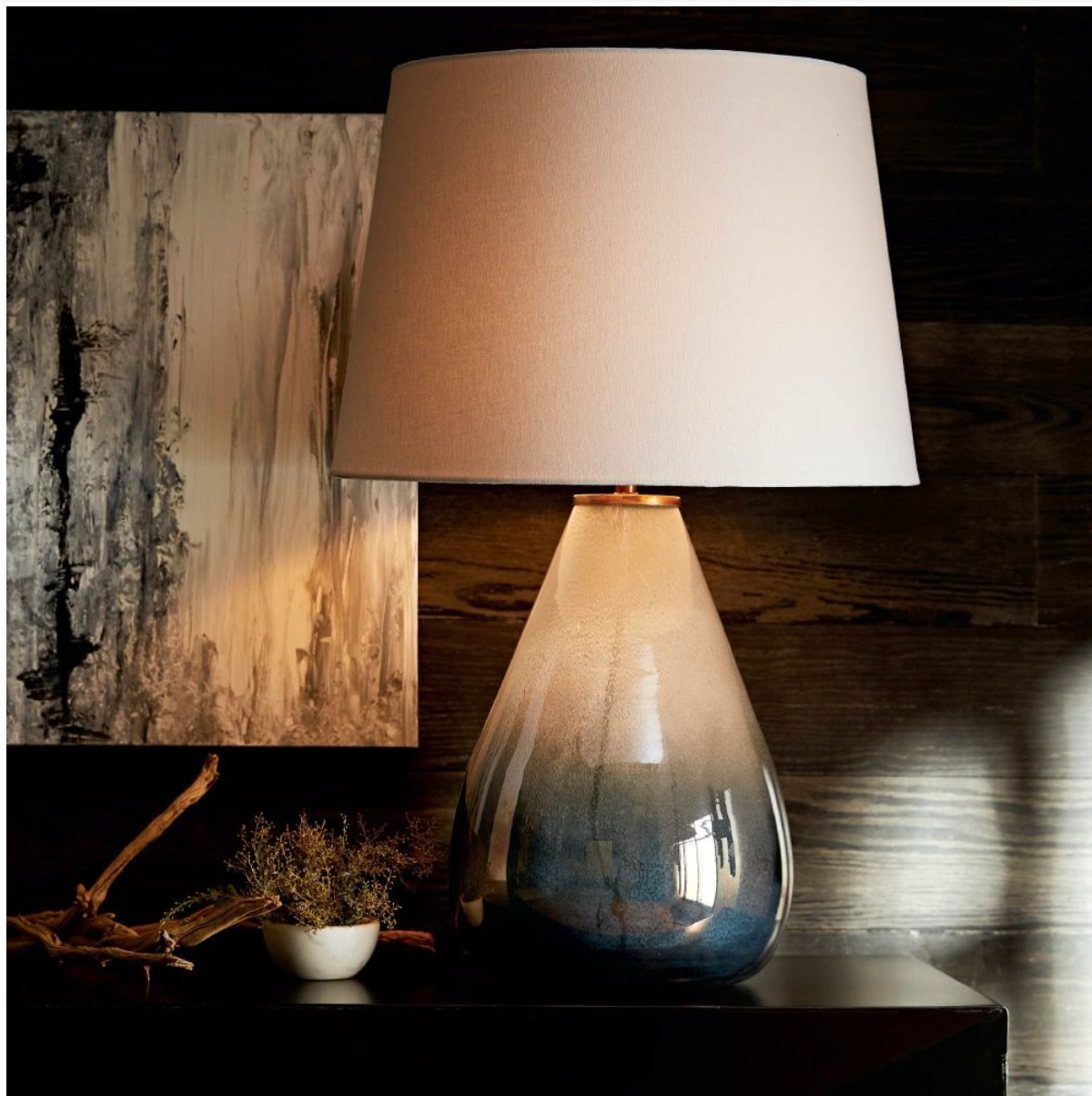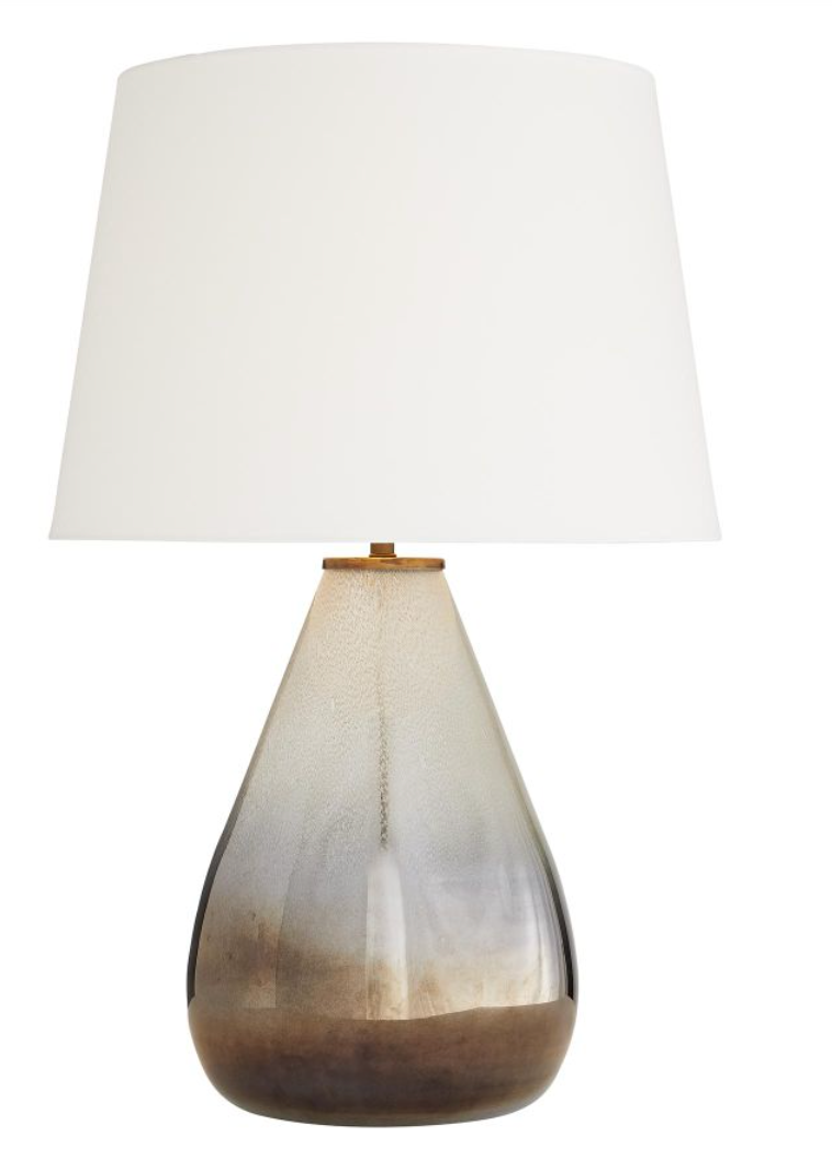 LIKE THE GATHERING OF STORM CLOUDS, THIS LAMP BRINGS MYSTERY AND MOXIE. THE LARGE-SCALE SLEEK FORMATION OF THE SEEDED GLASS BASE IS FIRST MOUTH-BLOWN AND THEN FINISHED IN A SMOKE LUSTER OMBRE TO CREATE ITS DARK AND MOODY FEATURES, WHICH ARE LIFTED WHEN ILLUMINATED. TOPPED WITH A TAPERED WHITE LINEN SHADE WITH WHITE COTTON LINING AND AN ACRYLIC SPHERE FINIAL ON A BRASS BASE. FINISH WILL VARY.