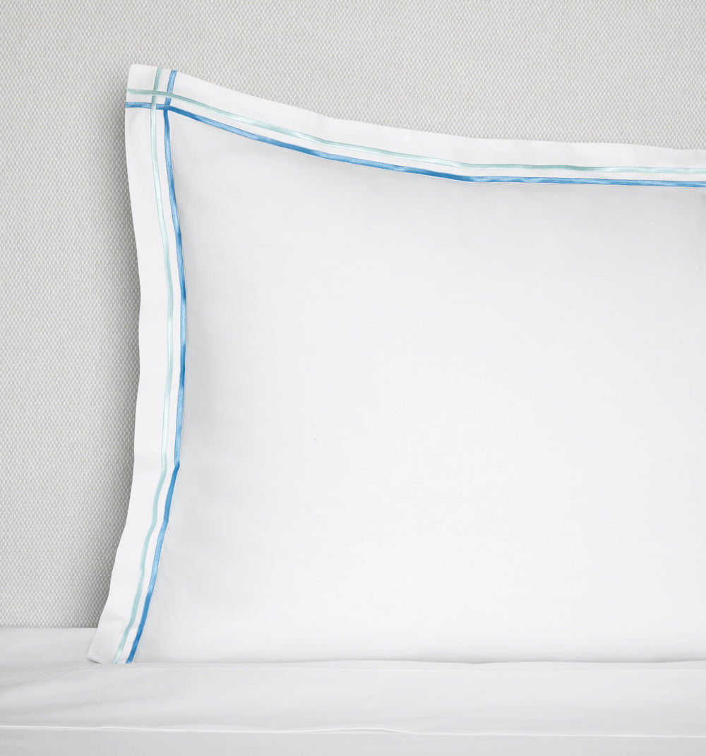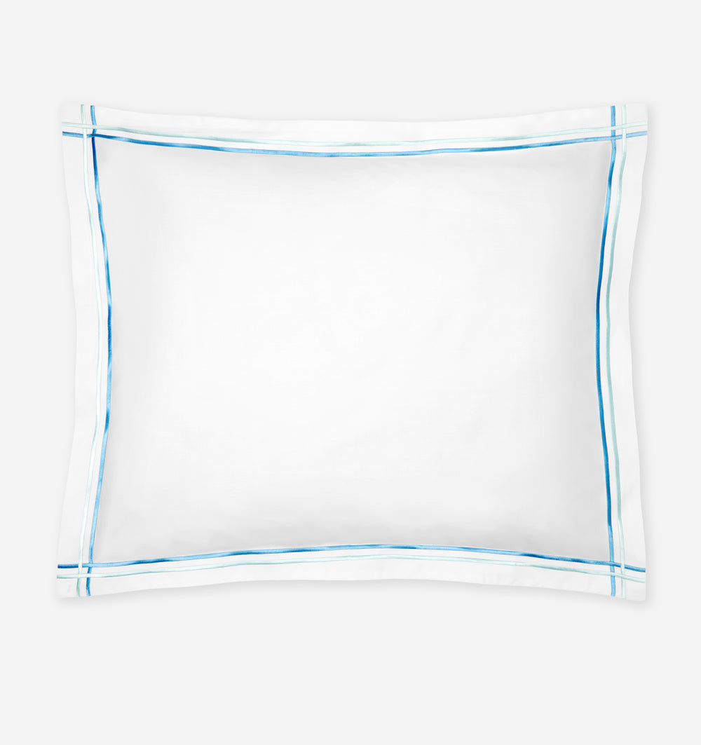 A double border of blue satin-stitch makes a stylish statement in the Tratto. Paired with the charming Plaidino, a collection of French blue plaid rendered in watercolor brushtrokes, this bedding transforms the bedroom into a serene blue sanctuary.
