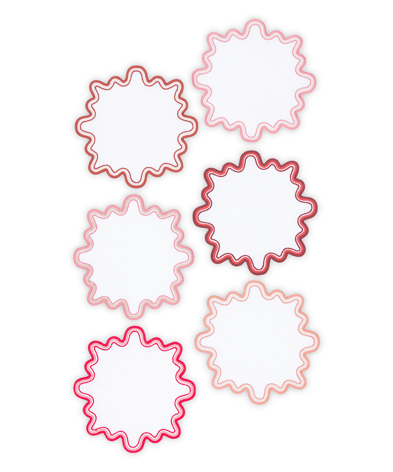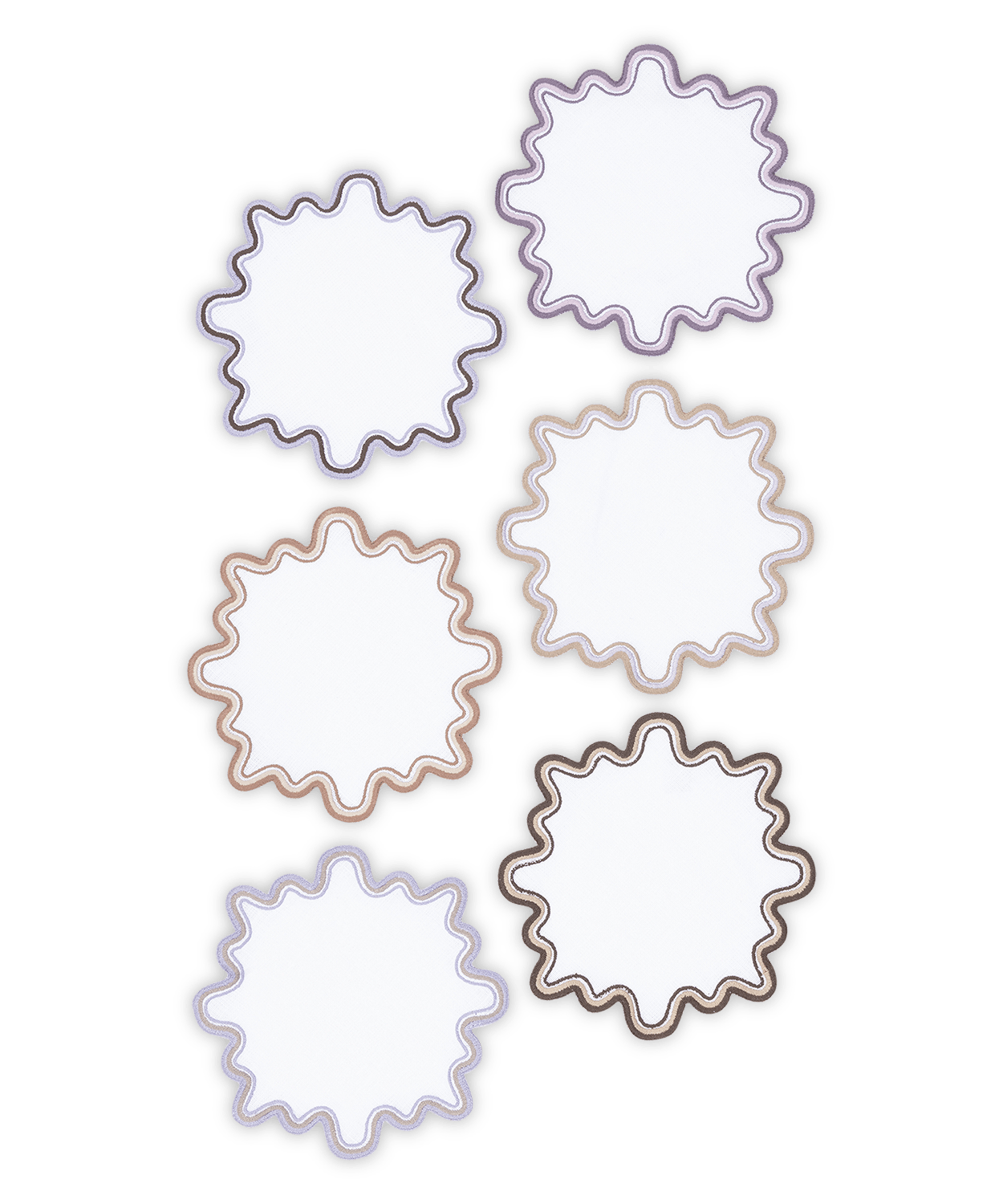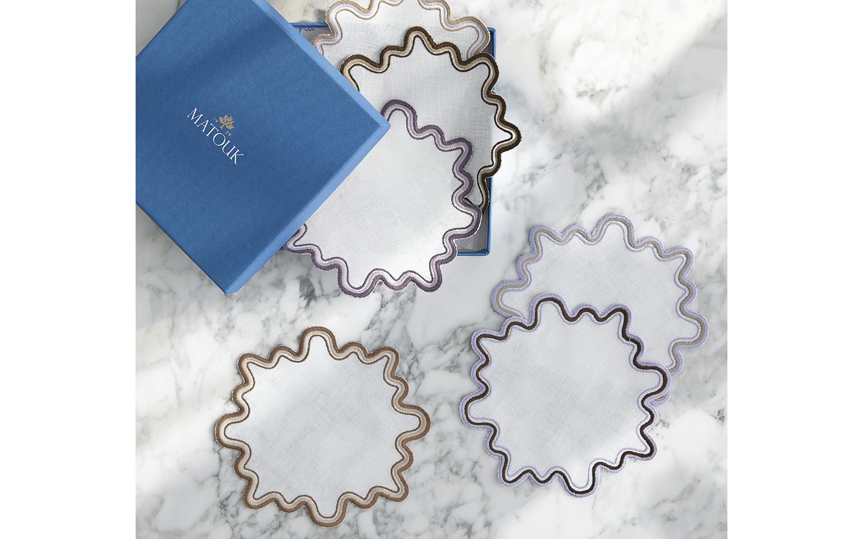 Add a splash of joie de vivre to your next gathering with the Wave Cocktail Napkin Set by Matouk. Each of the six linen napkins features a playful wave-shaped silhouette, highlighted by a meticulously embroidered two-tone border. With six unique color combinations in every set, these napkins make a vibrant statement on any table.