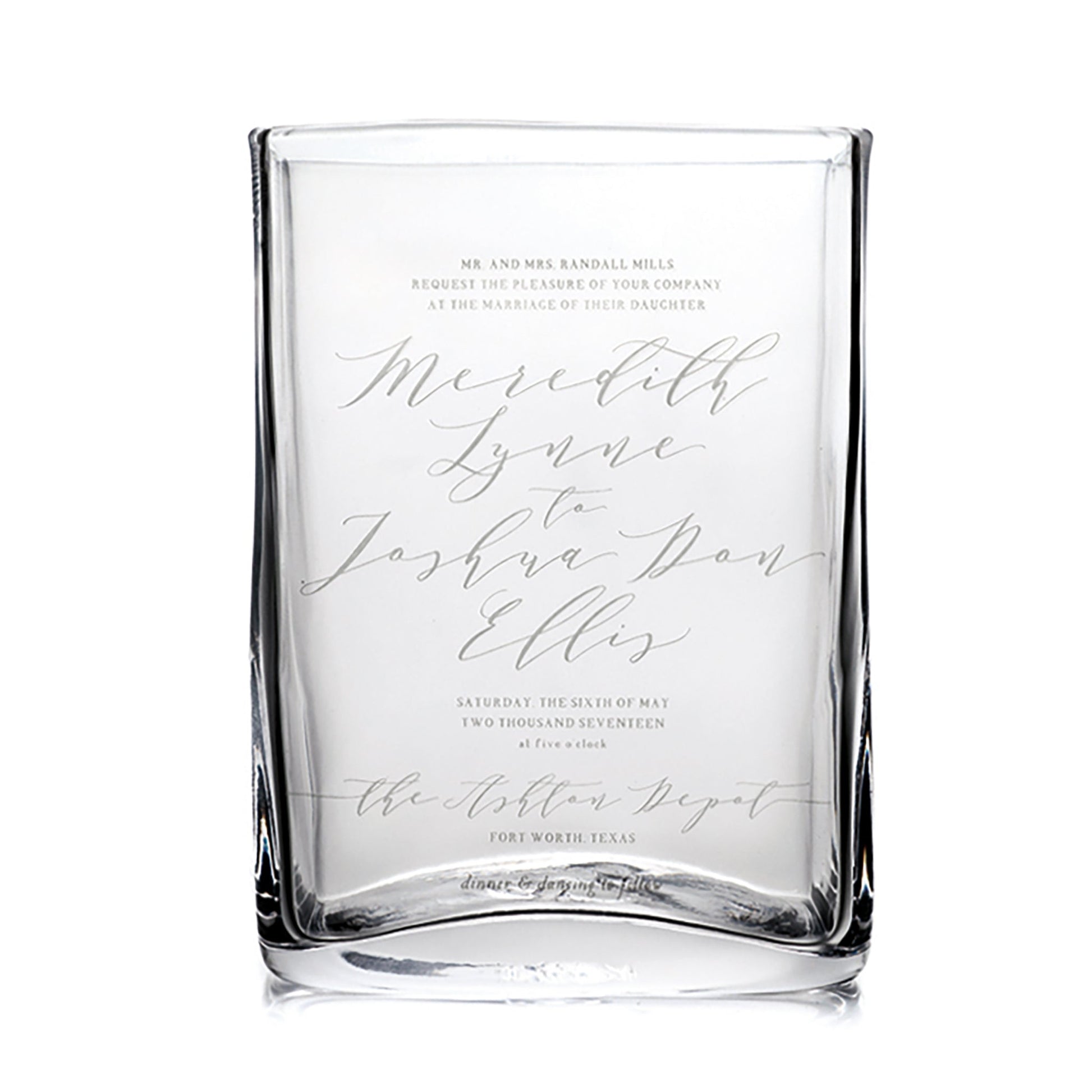 Say “I do” to a truly one-of-a-kind wedding gift. Our Weston Vase—known for its elegant lines and sculptural presence—is transformed into a lasting keepsake when engraved with the couple’s wedding invitation. A timeless way to commemorate the Big Day in brilliant, handblown glass.