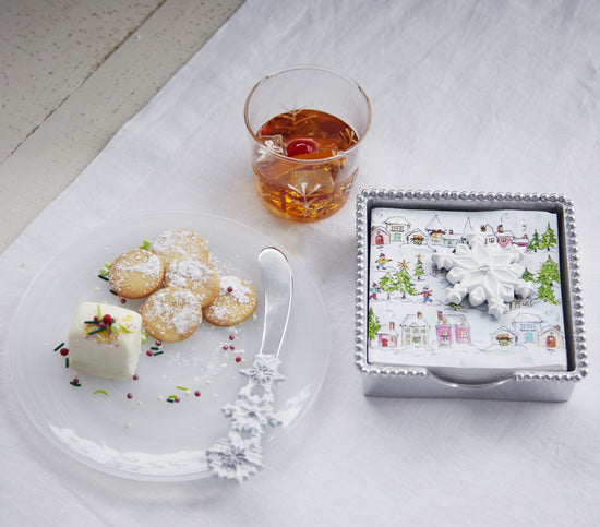 Transform your table into a winter wonderland with the White Snowflake Beaded Napkin Box Set, a magical addition to your winter and holiday decor. Handcrafted from 100% recycled aluminum.