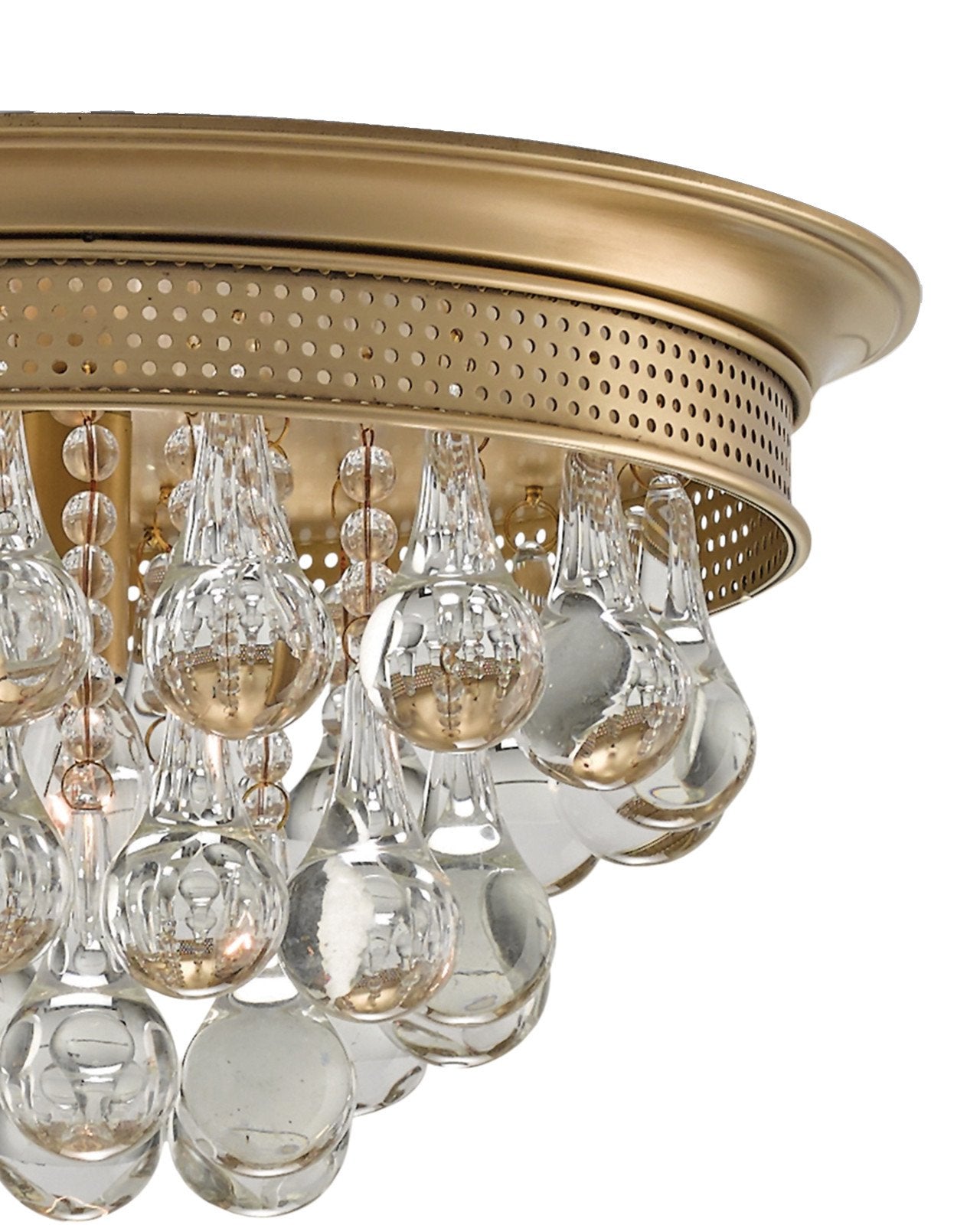 Crystal droplets rain down from the center of the Worthing Flush Mount. The opulence of the crystals contrast the perforated brass ceiling mount in an antique brass finish. The stylish juxtaposition of materials on this gold flush mount exudes both lightness and warmth.