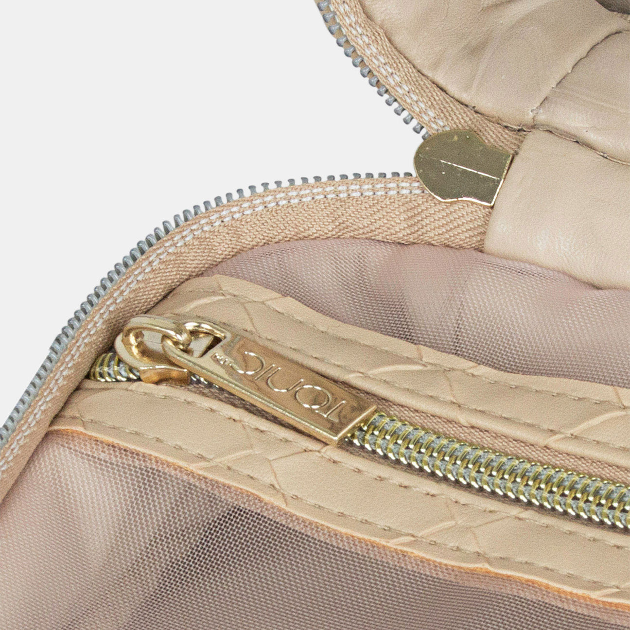 Beautiful double gold zips open to two large compartments where you can keep and easily view all your items. The separate zipped compartment is handy for storing makeup brushes, hair accessories, or any smaller item.