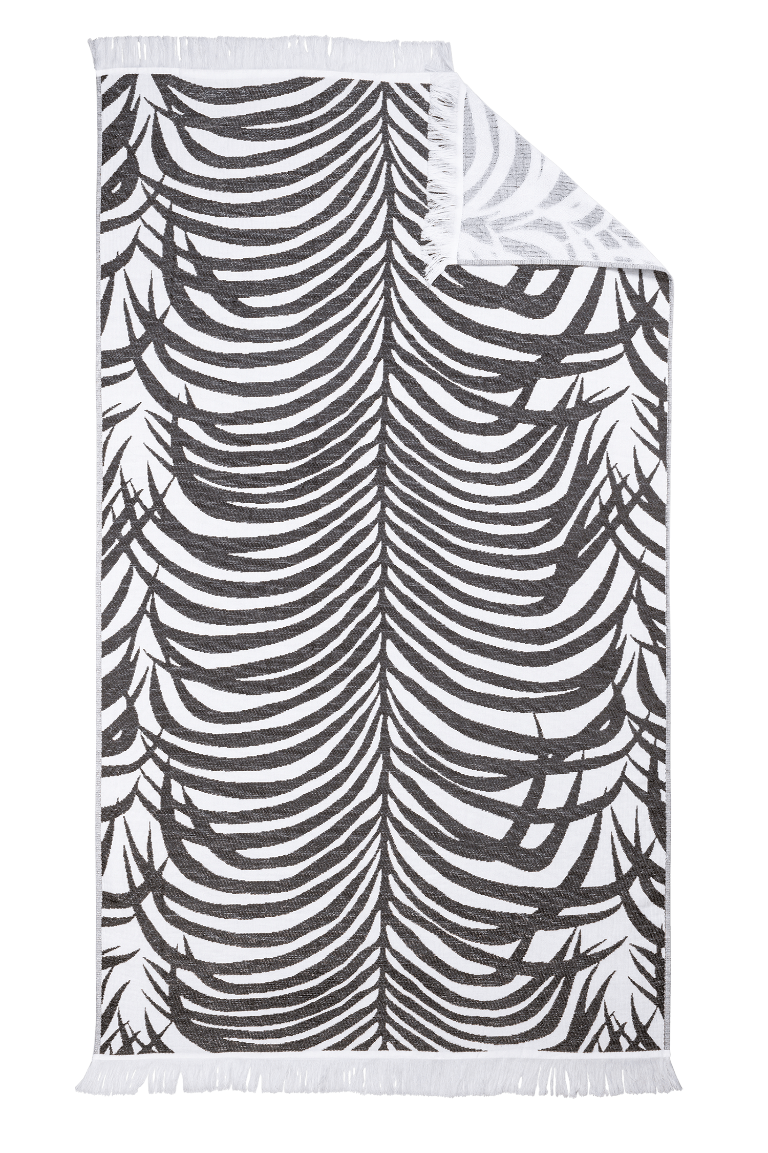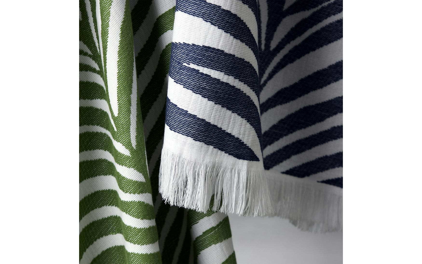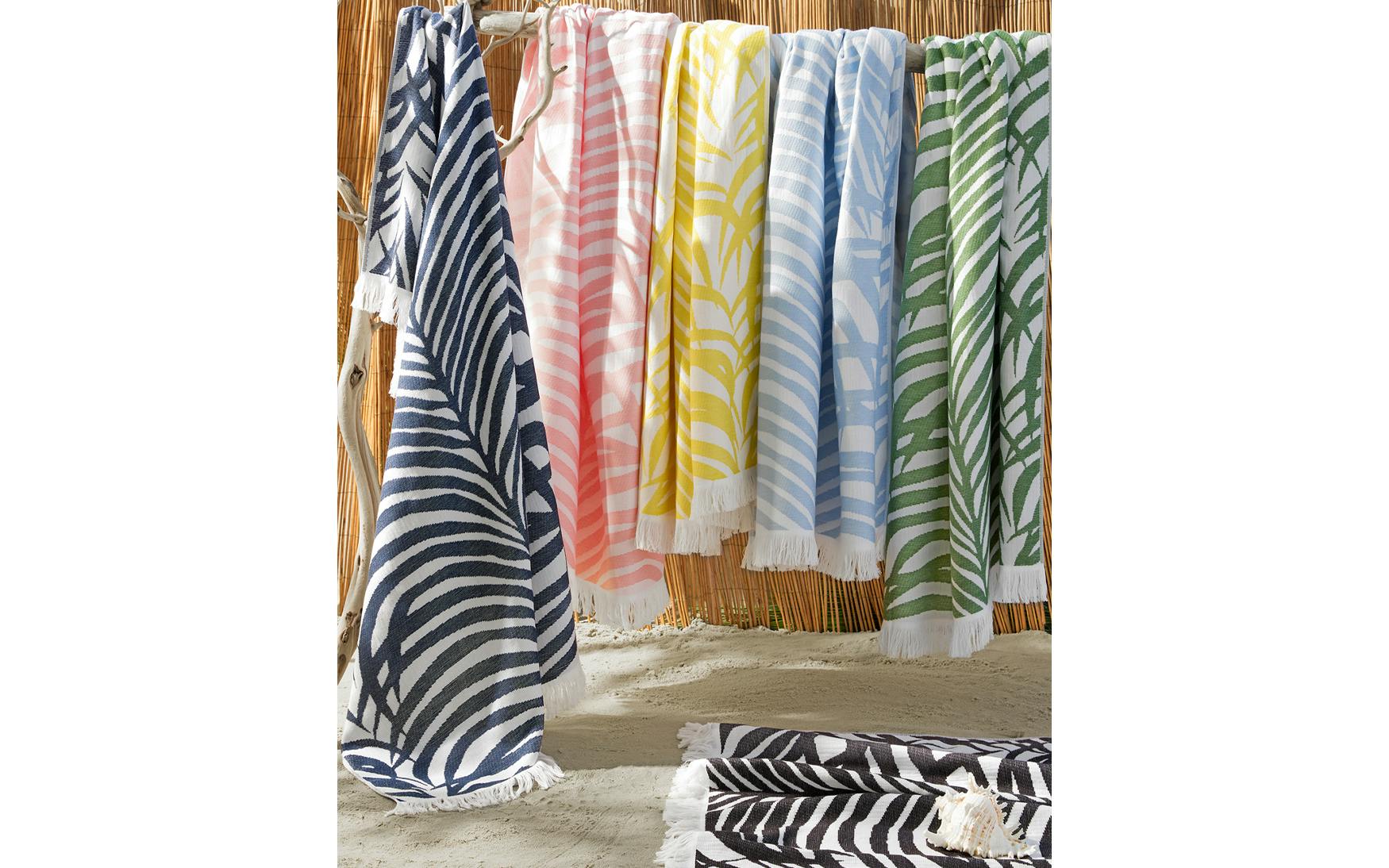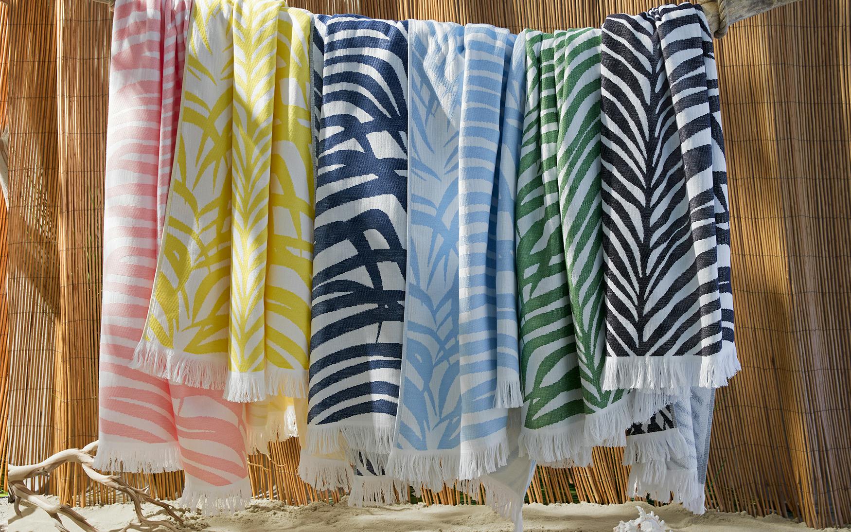 A bold statement piece for sunny days, the Zebra Palm Beach Towel by Matouk is inspired by an iconic Schumacher design and brings together two timeless motifs—tropical palms and zebra stripes. Vibrant colored threads are woven into plush white cotton terry to create a lightweight towel with a hand-loomed look and feel. Eye-catching and comfortable, it’s perfect for beach escapes, poolside lounging, or adding personality to your summer essentials.